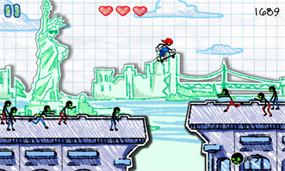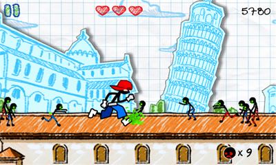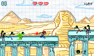 С целью разнообразить бесконечную монотонную беготню, создатели прикрутили довольно неплохую систему бонусов, включающую в себя дополнительные жизни, оружие и даже транспорт. Вдобавок за каждого убитого зомби Вам будут зачислять очки, которые затем можно потратить на прокачку умений. Не сказать, чтобы это радикально меняло геймплей, но играть всё равно становится намного интереснее. Дизайн игры выполнен в скетчевой манере: все фоны и персонажи будто бы нарисованы карандашом на смятом тетрадном листке. Подход отнюдь не новаторский, однако выглядит довольно стильно. Весь процесс сопровождается различными этническими мотивами, в строгом соответствии с происходящим на экране.