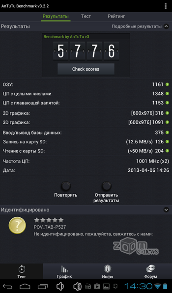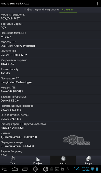 Показатели Point of View ONYX 527 в AnTuTu Benchmark v3.2.2 не рекордные, но вполне приличные. В сочетании с гигабайтной встроенной памятью двухъядерный процессор работает стабильно и визуально без тормозов.