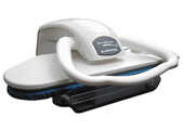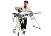 Похожий на большую кроссовку большого баскетболиста — Tefal Pro Express Total GV8961 ныне «парогенераторный» флагман в соответствующей линейке от Tefal. Здесь многое сделано для того, чтобы пользователь гладил если уж не с удовольствием (глаженье — всё же нет прогулка по парку в солнечный день), то по крайней мере без отрицательных эмоций. Встроенный процессор здесь контролирует температуру подошвы утюга и интенсивность подачи пара, «вырабатывает» в этом смысле правильный симбиоз. Предусмотрена постоянная подача пара, режим «Паровой удар», возможно использование прибора для вертикального отпаривания. Пользователю доступны три настройки для оптимального качества глаженья разных типов ткани. Большинстве вещей следует гладить в режиме Normal, вещи более плотные — в режиме повышенной интенсивности парообразования и нагрева подошвы (Jeans), деликатные вещи из тонких тканей — в режиме Delicate. Все подробности о том что и в каком режиме гладить есть в руководстве по эксплуатации. Кнопки активации режимов находятся на небольшой панели управления на корпусе парогенератора (на утюге в «обычном» месте ничего нет). Ещё на панели есть основная кнопка включения, а также световые индикаторы нехватки воды в контейнере и необходимости очистки парогенератора от накипи. Последнее не доставляет проблем — просто выкручивается из корпуса специальный металлический коллектор на котором вся накипь собирается, промывается, вкручивается обратно и всё — можно гладить дальше (в парогенераторе можно использовать воду непосредственно из крана, кипятить не обязательно). Контейнер для воды съёмный — неудобств с его наполнением не возникает (можно наполнять его водой даже не отключая парогенератор).