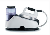 Доступна постоянная подача пара на обрабатываемые вещи, паровой удар, возможно вертикальное отпаривание.Подошва утюга здесь называется SteamGlide («Паровое скольжение») Паропроводящие отверстия подошвы распределены по ней таким образом, чтобы при подаче пара обеспечивалось лёгкое скольжение утюга по обрабатываемой вещи и, при этом, обеспечить хорошее проникновение в вещь пара. Материал подошвы — металлокерамика, основа — легированная нержавеющая сталь. Вообще, даже без подачи пара утюг без проблем перемещается по любым вещам. На панели управления парогенератора есть только одна кнопка — включения-выключения. Она же, если нажимать её в течение пары секунд, переводит парогенератор в экономичный режим — менее интенсивная подача пара обеспечивает экономию электричества. Около кнопки есть световые индикаторы наполненности съёмного контейнера для воды (можно снять и наполнить не выключая парогенератор) и необходимости очистки прибора от накипи (для этого здесь тоже есть выкручивающийся металлический стержень-коллектор. Прибор тоже легко переносить — утюг устанавливается на парогенератор, заходит в специальный паз задней частью, а спереди «пристёгивается к нему защёлкивающим устройством. Правда, в отличие, например, от модели Tefal, защёлка держит утюг за подошву, которая, при переноске, во многом принимает на себя вес парогенератора, так что переносить следует аккуратно и желательно не злоупотреблять переносами с наполненным контейнером для воды. Для хранения обоих проводов (комбинированного и электрического) в корпусе парогенератора есть отсеки. Автосматывания электропровода здесь нет.