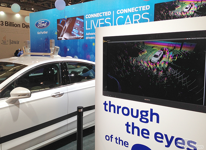 Интересной показался и стенд компании Ford, на нем был представлен прототип нового седана Ford Mondeo, оборудованный радарной системной идентификации ближайшего окружения. В реальном времени на большой монитор выводилась картинка с радарной системы, по ней можно было судить о высокой точности локационной системы. Внешняя часть системы заключалась в трех сканирующих цилиндрических модулях, расположенных на крыше.