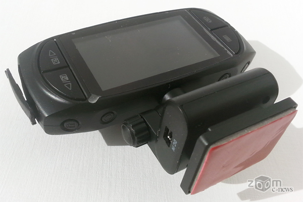 Торец корпуса справа чистый, а слева под резиновой заглушкой расположены интерфейсные разъемы miniHDMI, miniUSB. Заглушка крепится к корпусу небольшим резиновым жгутиком, так что не потеряется, в паз корпуса входит плотно и в закрытом состоянии держится довольно надежно. Надо сказать, что закрыть эти разъемы заглушкой — мысль хорошая, так как используются они не часто, если не сказать редко (даже вполне можно себе представить такую ситуацию, что они и вовсе не понадобятся): miniHDMI, понятное дело, нужен для подключения при помощи шнура HDMI-кабеля к телевизору или любому другому внешнему видеомонитору (кабель HDMI в комплекте поставки отсутствует), а данный порт miniUSB служит для подключения регистратора к ПК или ноутбуку для копирования видеороликов. А вот для подключения кабеля питания от автомобильного адаптера у видеорегистратора RoverEye Tesla A7 2.7 используется второй порт miniUSB, который расположен в подставке. Такое решение так же вполне разумно, кабель питания подключается в гнездо, расположенное достаточно близко к стеклу, такая конструкция позволяет отвести его вдоль лобового стекла вверх за зеркало заднего вида, и под обшивкой обвести вокруг лобового стекла к гнезду прикуривателя. А четыре метра длины идущего в комплекте кабеля автомобильного адаптера сделать это вполне позволяют. В подставке также расположен USB-разъем для подключения внешнего модуля Wi-Fi/GPS. Напоминаем, что в комплекте данной модификации регистратора этого модуля нет, и для использования регистратора без этого дополнительного модуля разъемы в подставке так же закрываются резиновой заглушкой. Размеры подставки небольшие. Регистратор к ней крепится на двухосном шарнире — угол поворота как в вертикальной, так и в горизонтальной плоскостях составляет 180°, то есть объектив легко можно повернуть прямо в направлении к левому или правому окну от водителя (что частенько бывает не лишним). К лобовому стеклу подставка крепится небольшой платформой с клейким 3М-скотчем (в комплекте поставки таких платформ две штуки).
