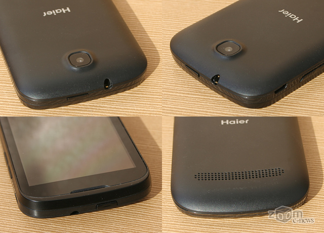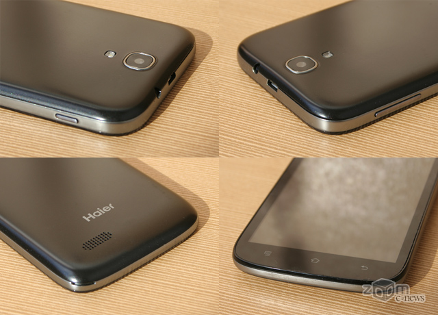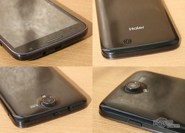 Органы управления и интерфейсные разъемы Haier W701 расположены несколько непривычно, на правой грани находятся порт micro-USB и клавиша громкости, а аудиовыход 3,5 мм «мини-джек» и кнопка питания сверху. Несмотря на то, что толщина корпуса немногим более сантиметра, в целом аппарат не выглядит толстым.