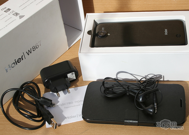 Комплект поставки смартфона Haier W867 самый «богатый» из рассматриваемых в данной статье. Устройство комплектуется сетевым адаптером, USB-кабелем для подключения к зарядному устройству и компьютеру, телефонной гарнитурой и защитным чехлом. Также в упаковке покупатель обнаружит «Руководство пользователя» и гарантийный талон.