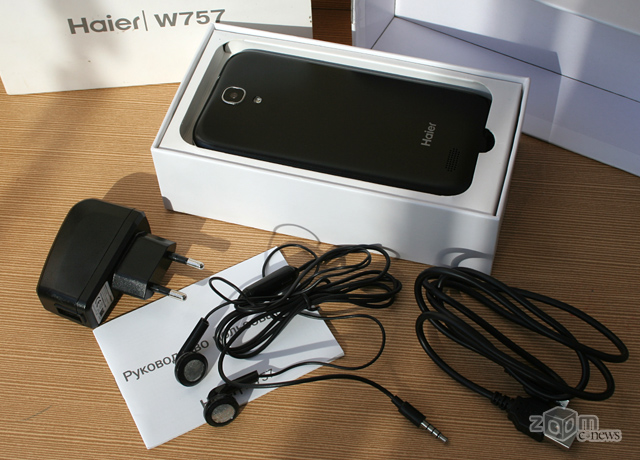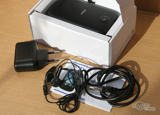 Поставляется смартфон Haier W701 в комплекте с зарядным устройством и USB-кабелем. Также, несмотря на крайне бюджетную цену, в комплектацию входит телефонная гарнитура. Ну и конечно, как и в других моделях, в комплекте идёт «руководство пользователя» и гарантийный талон.