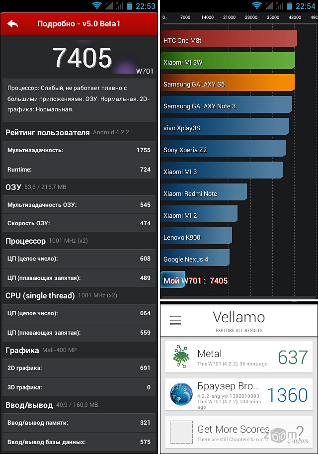 В результате испытаний мы получили следующие данные: AnTuTu Benchmark v5 — 7405 баллов, Vellamo Metal — 637, Browser — 1360 баллов. Тест Multicore пакета Vellamo смартфону Haier W701 осилить не удалось, а набор утилит 3DMark даже не запустился. Но не забываем, перед нами модель самого начального уровня.