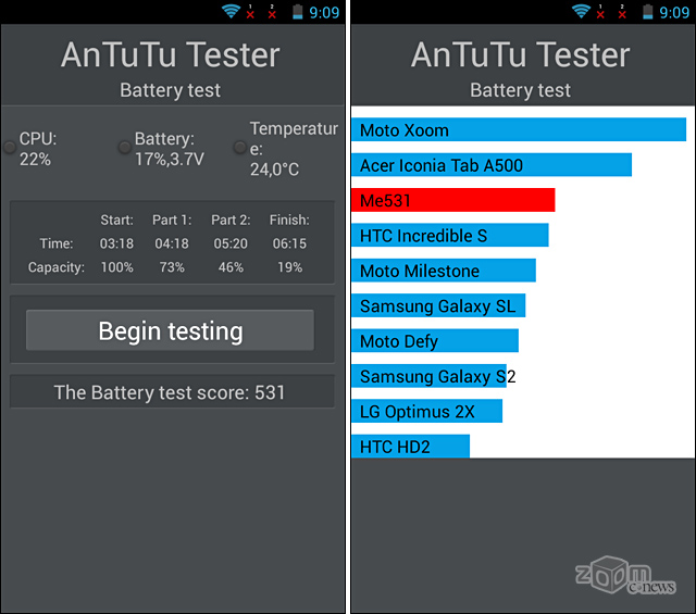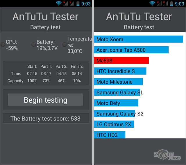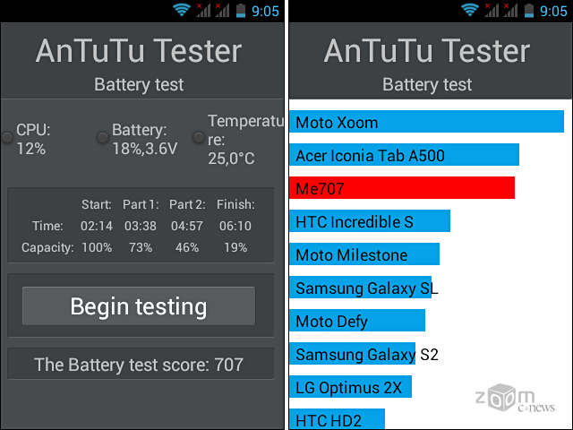 Полученный балл можно сравнить с другими устройствами, прогнав на них утилиту AnTuTu Tester. А время прохождения теста можно интерпретировать следующим образом: время непрерывного воспроизведения видеофайлов получаем умножением «общего времени» теста в 1,5 раза, то есть, смартфоны Haier W867 и Haier W757 на одном полном заряде аккумулятора смогут непрерывно крутить видео до четырёх с половиной часов (в реальности с 50% яркостью и 50% громкости в наушниках оба указанных смартфона крутят HD видео более 6 часов) а Haier W701 продержится в таком режиме больше пяти часов.