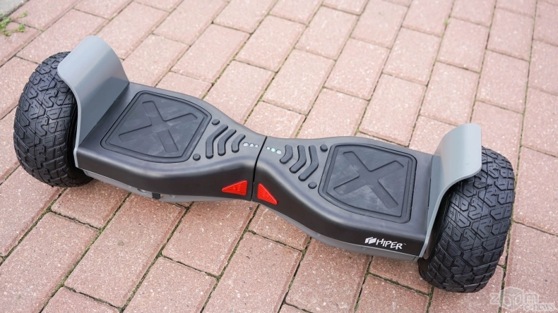 Минусом большинства моделей начального уровня, конечно же, является небольшой размер колёс. Электромоторы, встроенные в них, боятся сырости, а значит даже небольшие лужи для них – фатальный риск замыкания и внезапного выхода из строя. У HIPER EX90 в этом отношении всё сильно лучше, так как радиус его колёс 9 дюймов, а значит мелкие лужицы для этого устройства – не помеха. Это не означает, что владельцу гироскутера можно плевать на погоду, всё же лучше воздерживаться от езды в дождливую погоду. Не следует забывать, что внутри колёс расположены электромоторы, а электричество и вода – плохие соседи!