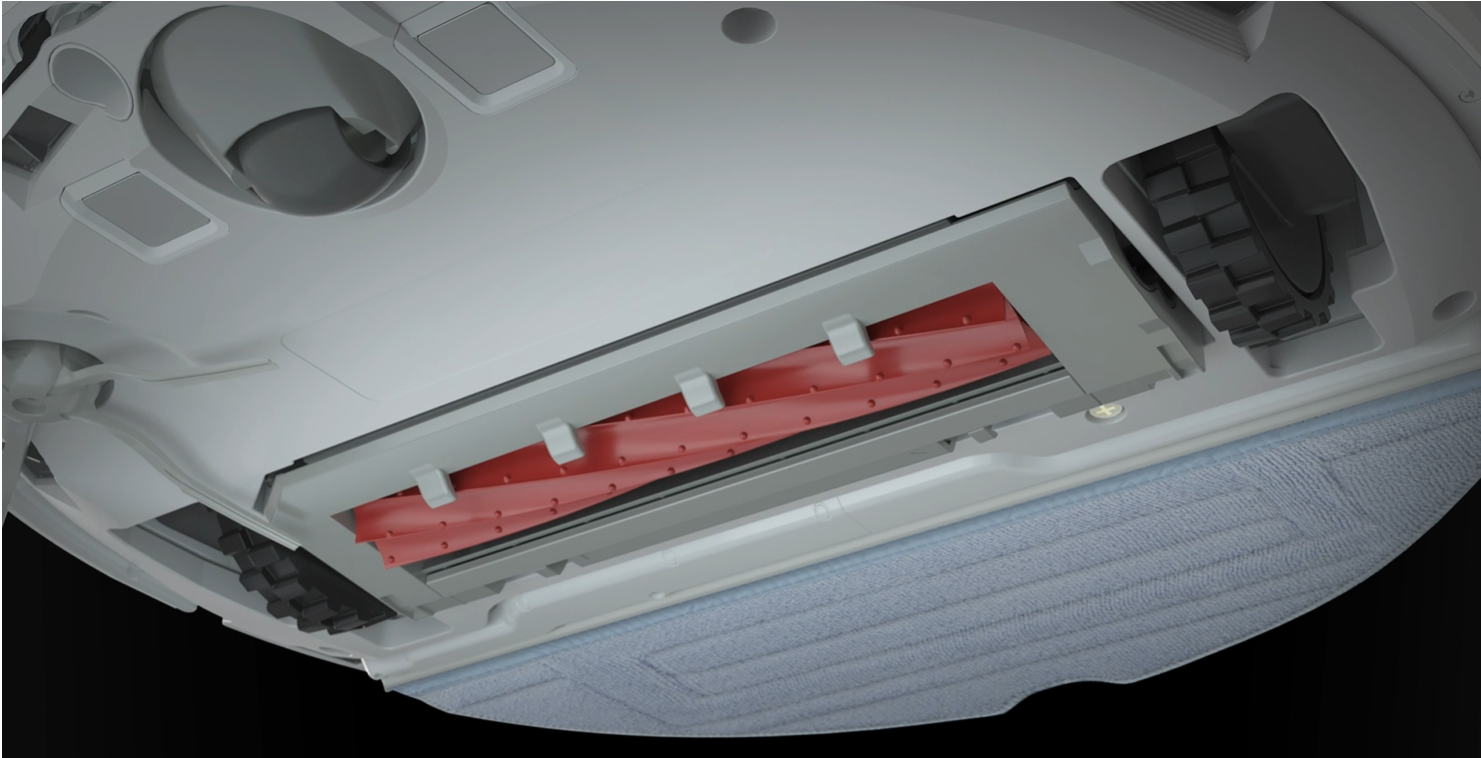 Бак для воды объемом 300 мл снимается сбоку, для чего нужно нажать на специальную кнопку-рычаг. Самая необычная деталь располагается на днище пылесоса: здесь используется не обычная щетка с ворсом, как в других роботах, а усовершенствованный центральный валик с жесткими резиновыми ребрами.