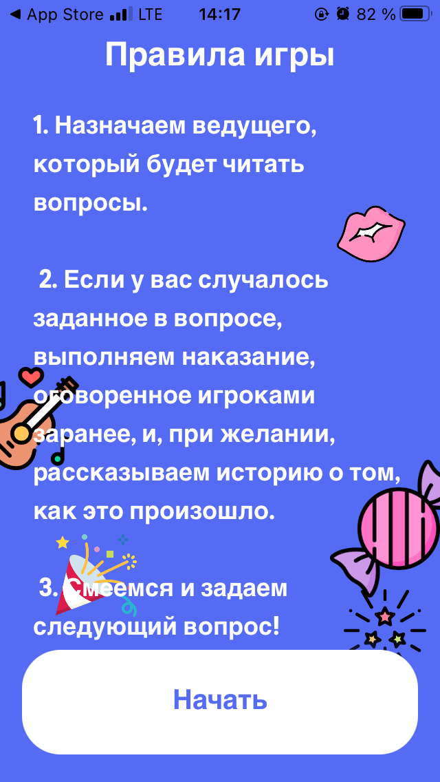 Игра для iOS, которая поможет сплотить компанию или перезнакомить всех гостей. Правила просты: нужно выбрать ведущего, который будет зачитывать вопросы, а остальные игроки отвечать, бывали ли они в такой ситуации. Тот, с кем случалось нечто подобное, выполняет задание или просто рассказывает, при каких обстоятельствах с ним это происходило.