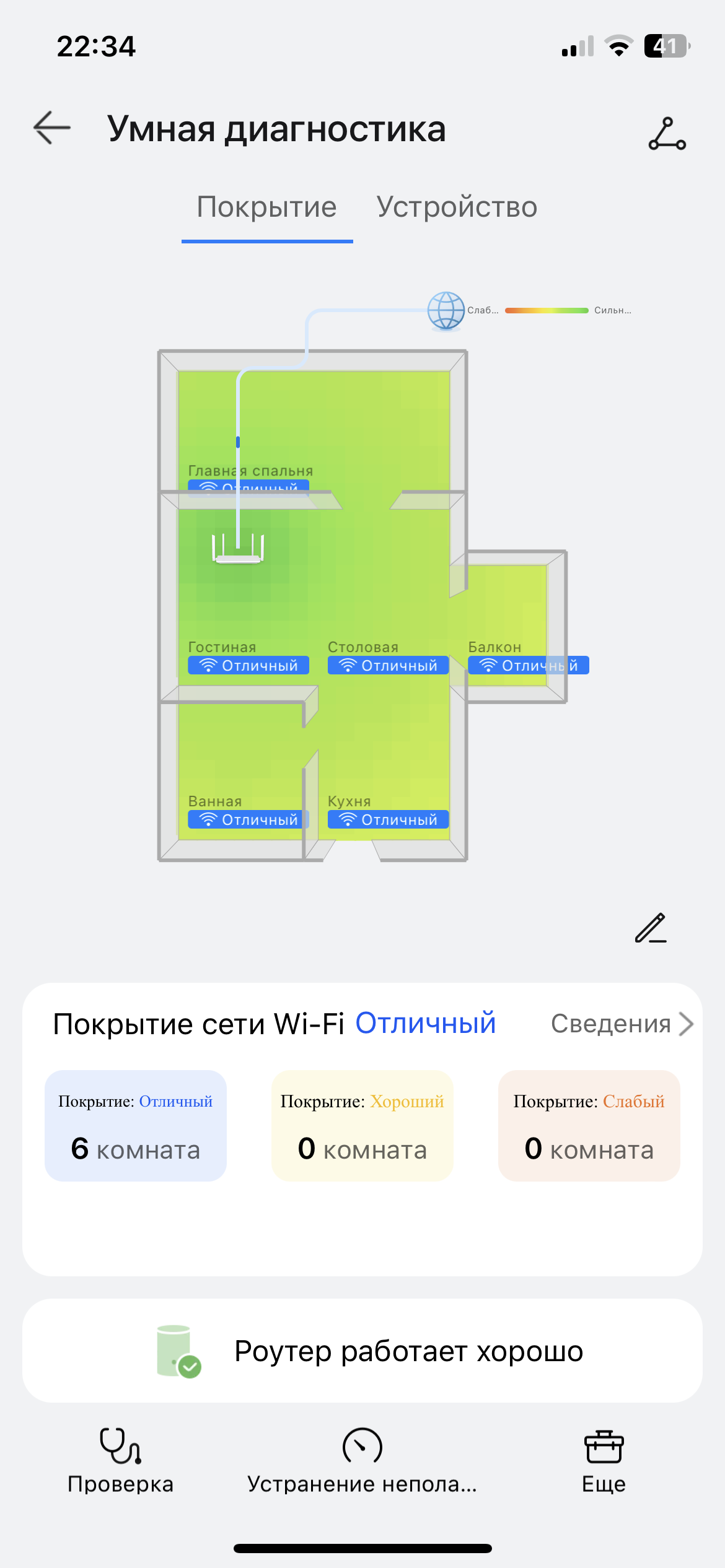 Посмотреть, как работает роутер и что с покрытием сети, можно в разделе «Умная диагностика». Тут предлагается вручную построить карту квартиры или выбрать из готовых и указать ее площадь. Далее система подскажет, куда переместиться с устройством, чтобы проверить качество приема сигнала во всех уголках дома. Далее на карте наглядно будет видно, где находятся подключенные гаджеты и что у них со скоростью интернета. В целом, очень удобно и не нужно для этого подключать специализированное ПО.
