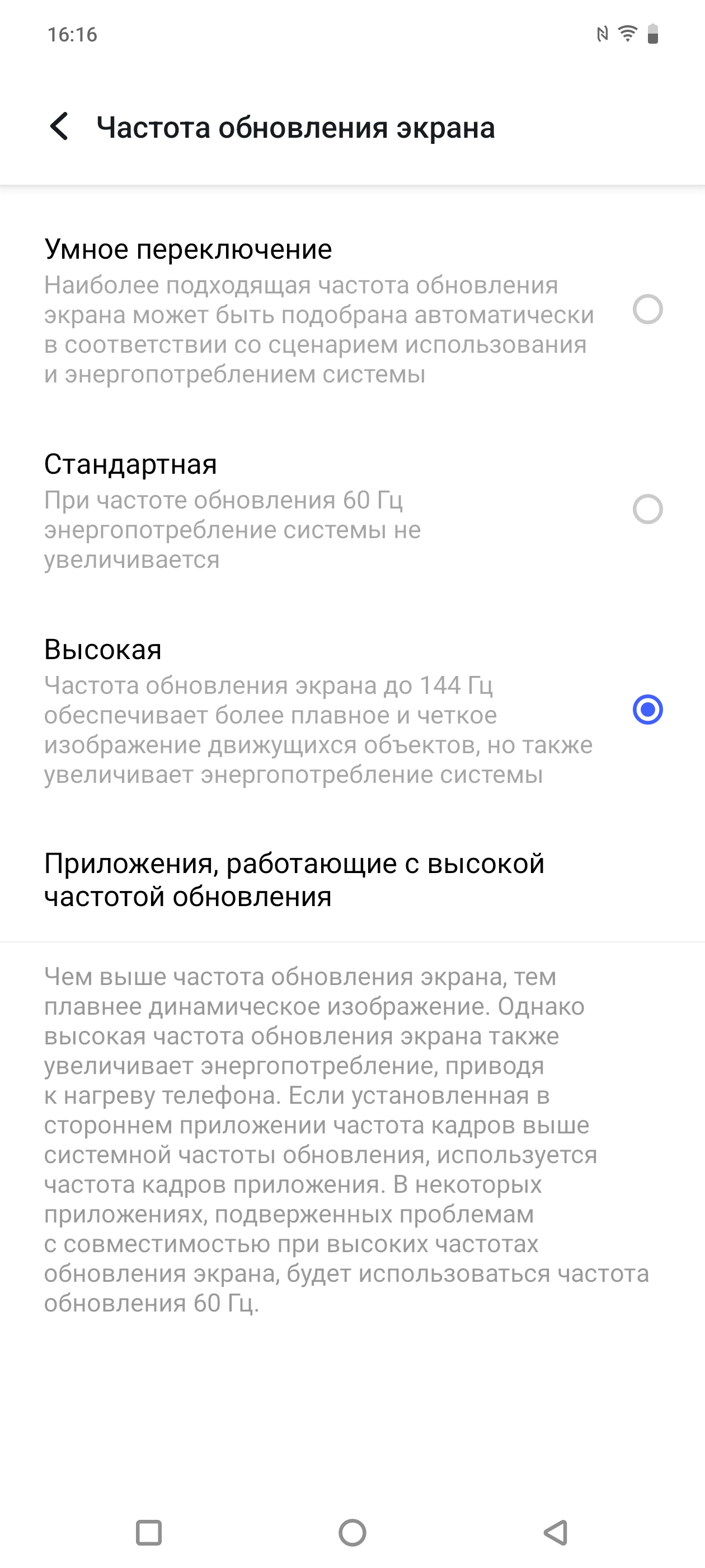Поддерживается повышенная скорость обновления экрана. Это обеспечивает плавное движение воспроизводимого контента в играх, при прокрутке больших массивов текста или страничек в браузере и просмотре динамичного видео. 144 Гц — это кому-то может показаться даже излишним, но предусмотрены опции и с привычными 120 Гц. Также можно отдать все на откуп процессору смартфона, который будет решать, какой режим выбрать в той или иной ситуации.