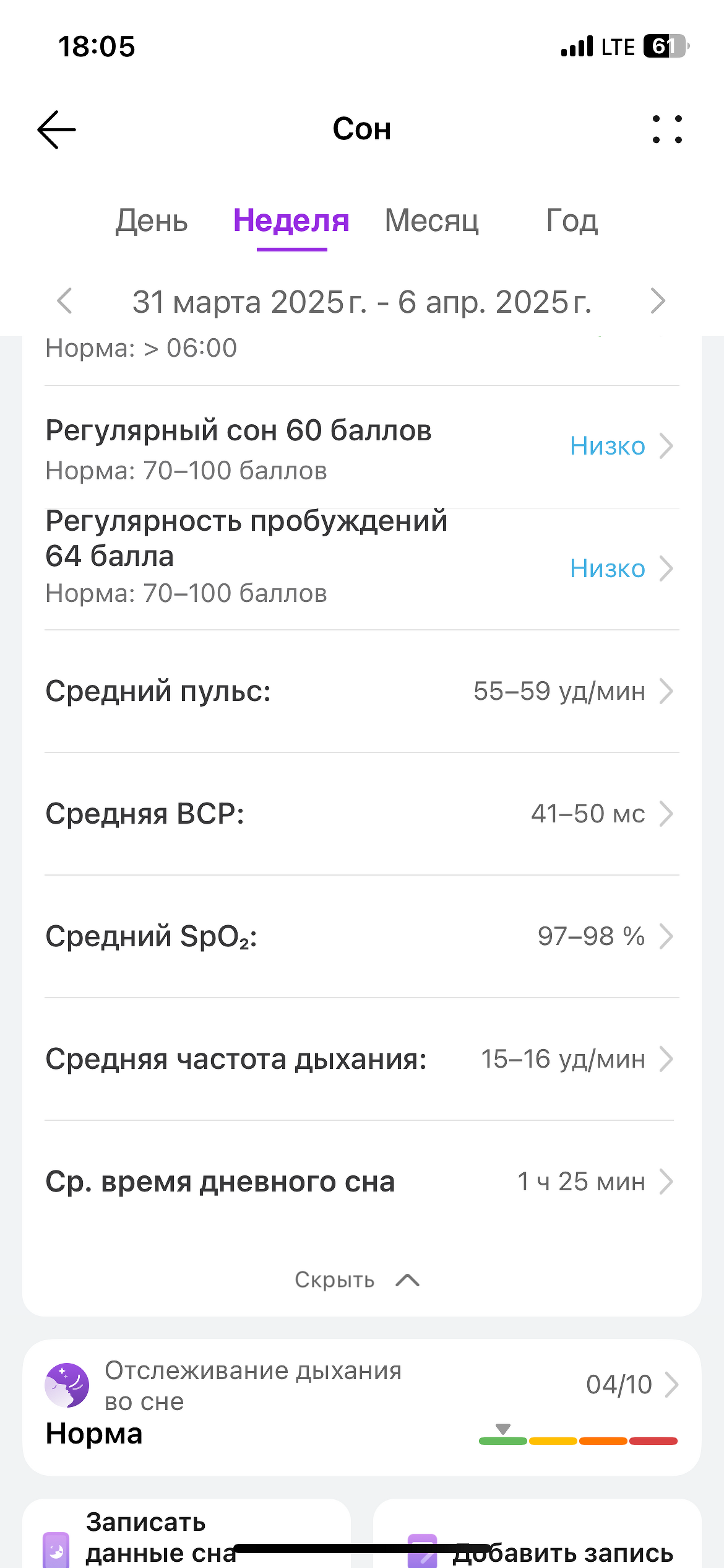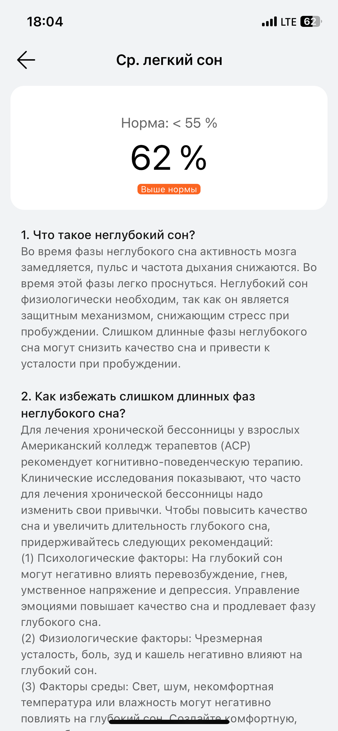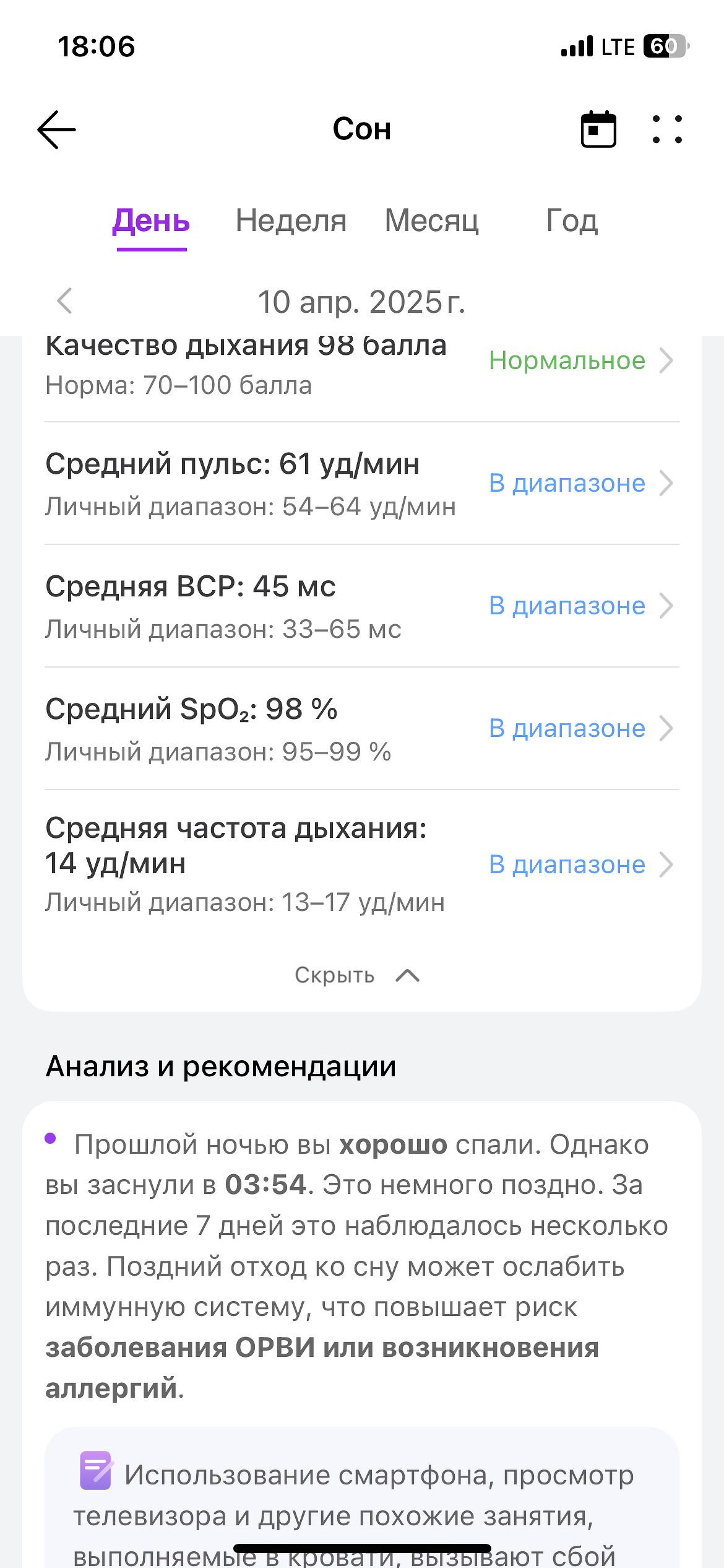 Браслет анализирует сон ежедневно и показывает, какие тенденции наблюдаются на протяжении недели и месяца. В соответствии с этим система дает достаточно простые советы. Вроде бы всем понятно, что нужно ложиться раньше, спать больше и так далее. Но в нашем случае удалось улучшить глубокий сон, когда убрали кофеин во второй половине дня и перенесли интенсивные тренировки на более раннее время. Так что можно сказать, что советы рабочие. Если есть цель улучшить качество сна, то Band 10 станет хорошим подручным инструментом.