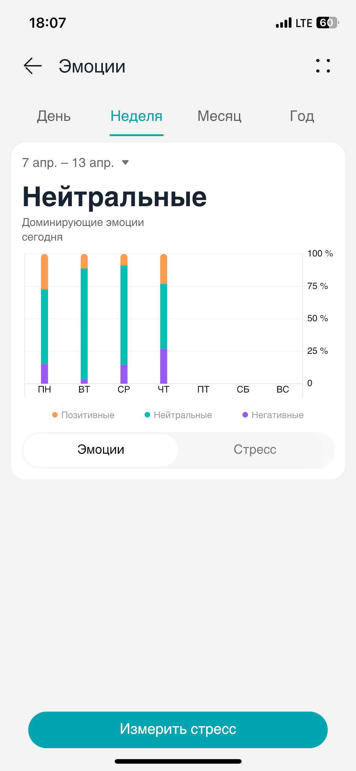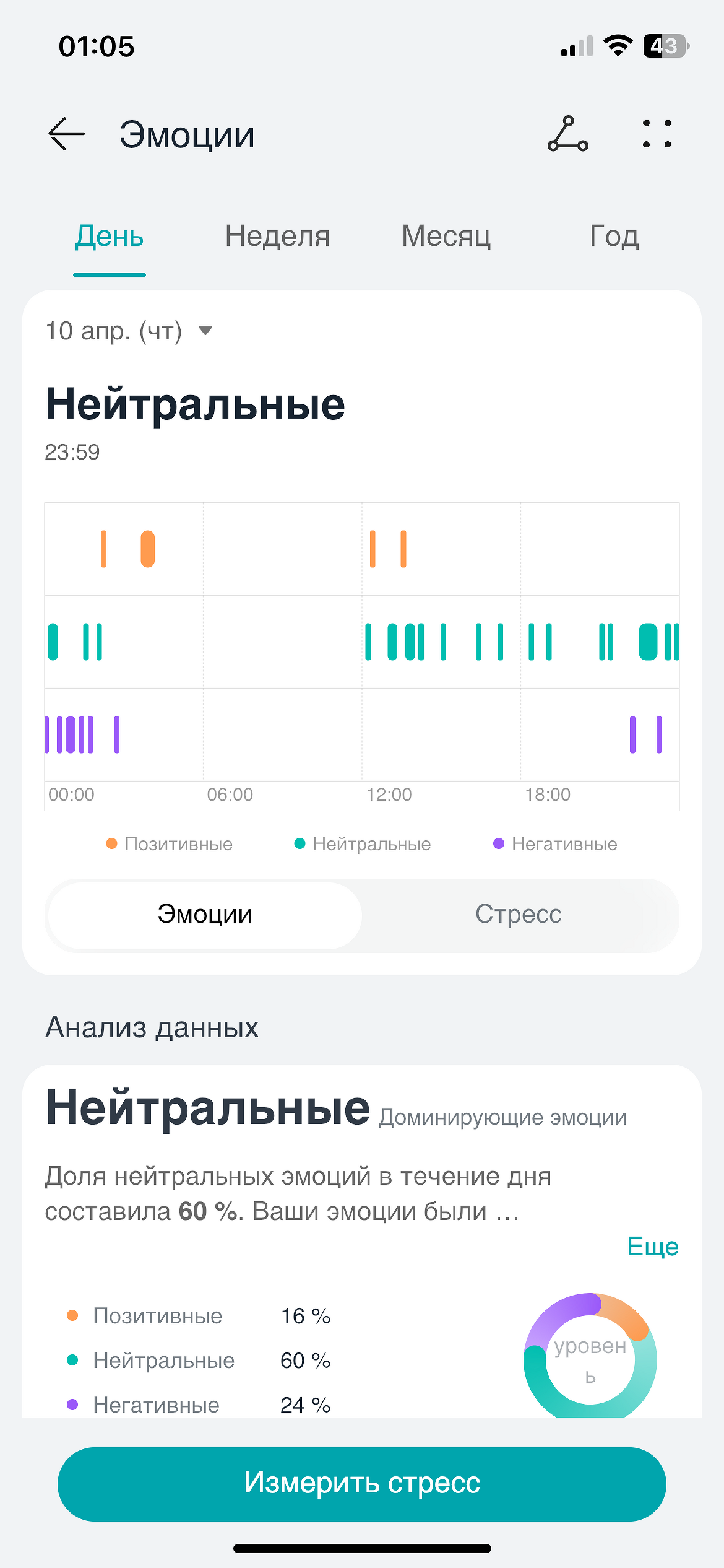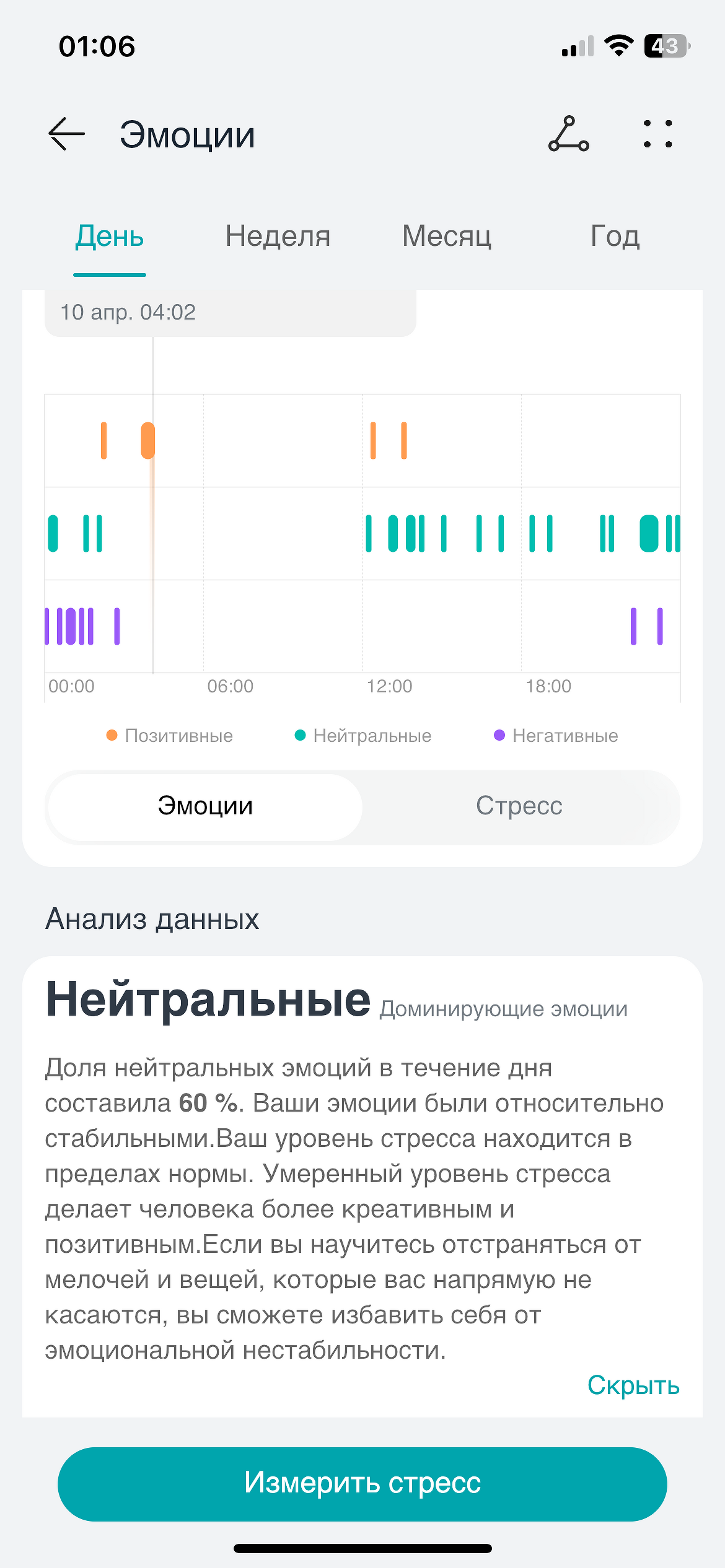 Конечно, мы сверили определение спектра эмоций гаджетом и «реальную жизнь». Например, по времени негативные эмоции совпадали с парой неприятных ситуаций, сдачей крови и просто очень сильной усталостью. Позитивные определились при встрече с друзьями и еще в какие-то рандомные моменты в течение дня. Правда, есть вопросы к выявлению позитивных эмоций в 4 часа утра — возможно, просто снился приятный сон?
