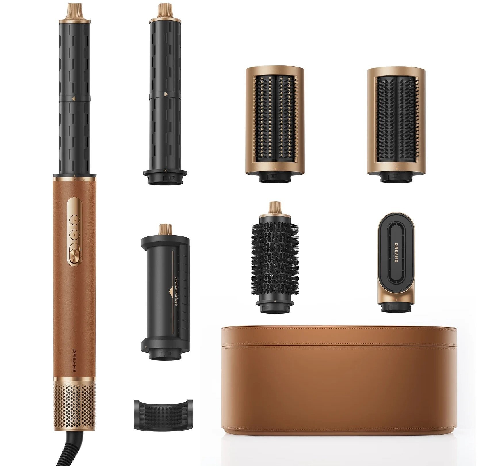 Dreame AirStyle Pro поставляется с семью различными насадками: для быстрой сушки, для непослушных волос, две насадки диаметром 32 мм для автоматической накрутки волос, жесткая и мягкая разглаживающие щетки, а также насадка-браш для объема.
