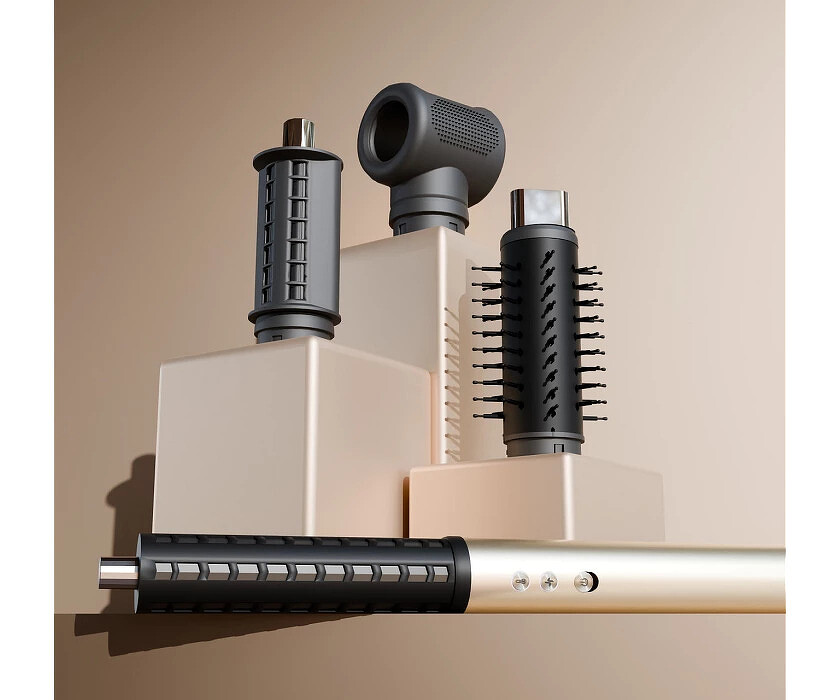 В комплект входят четыре насадки: для сушки, разглаживания, создания объема и локонов. Насадки для придания гладкости пушистым волосам и для накрутки локонов позволяют менять направления потока воздуха, а благодаря эффекту Коанда пряди сами притягиваются к стайлеру. Режим обдува холодным воздухом фиксирует прическу.