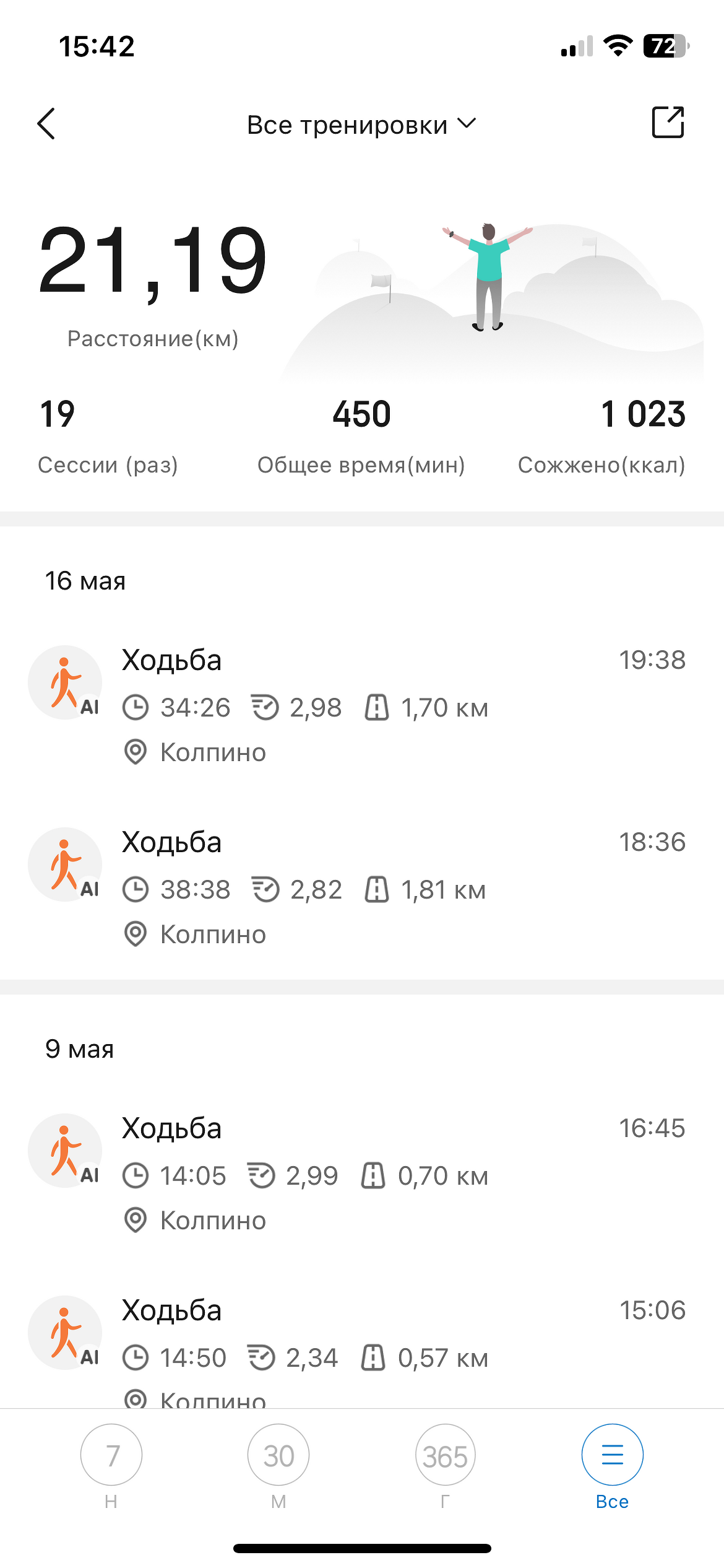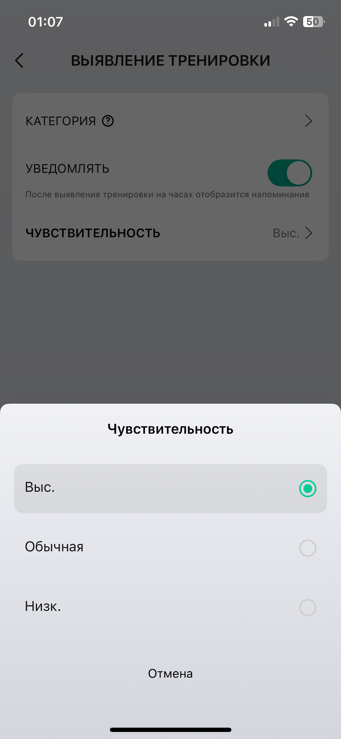 Поддерживается 140 разнообразных тренировок, есть автоопределение активности. И да, чувствительность автоопределения тоже можно настроить отдельно! Мы поставили высокий уровень чувствительности, и часы реагировали буквально сразу же, как только на прогулке ускорялся темп.