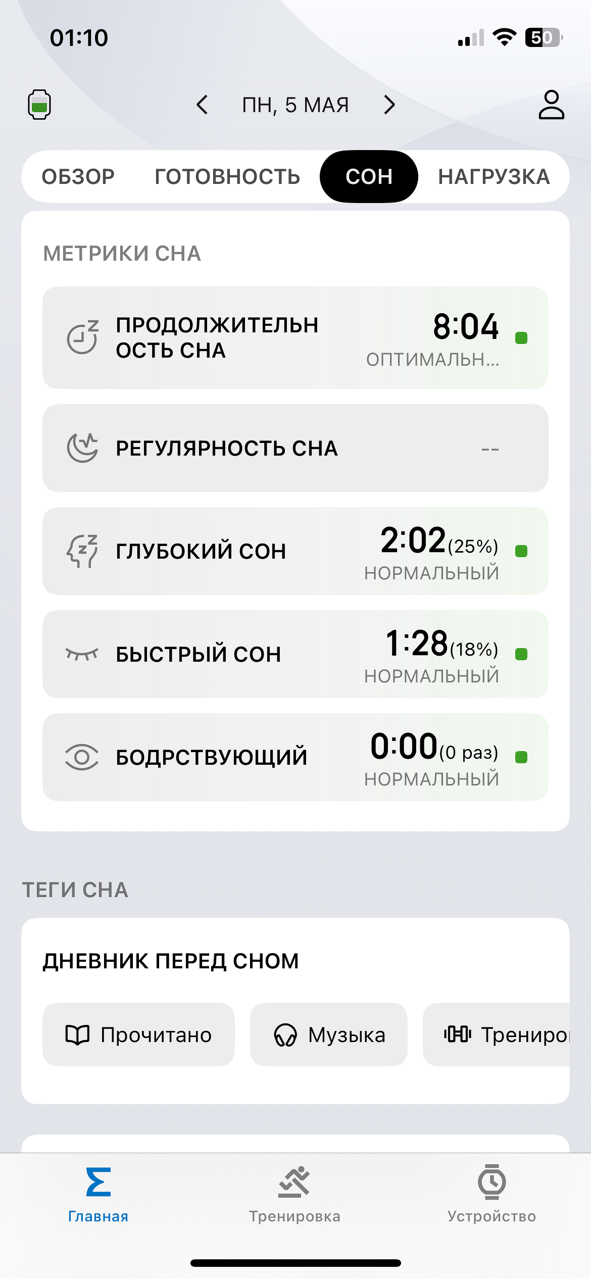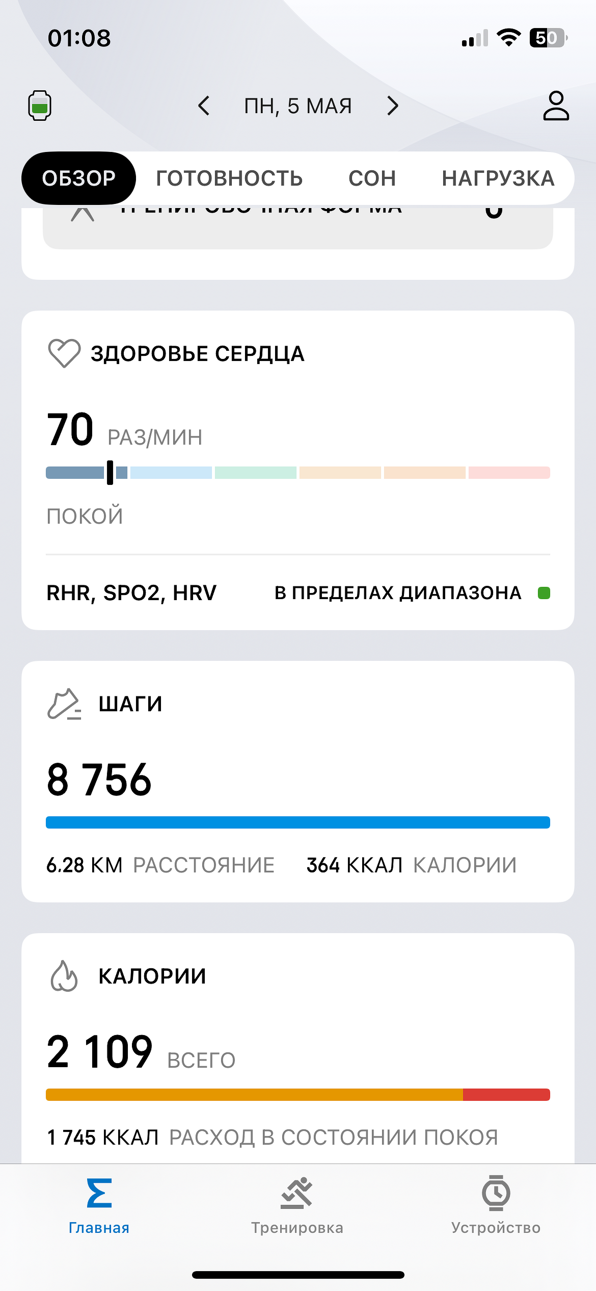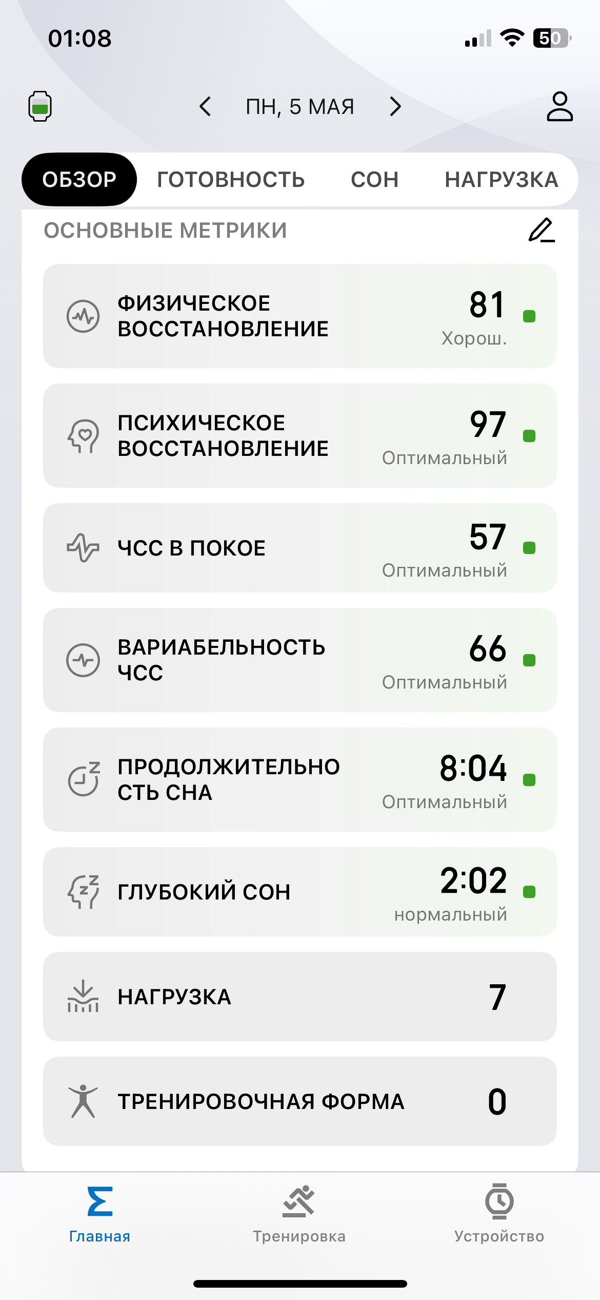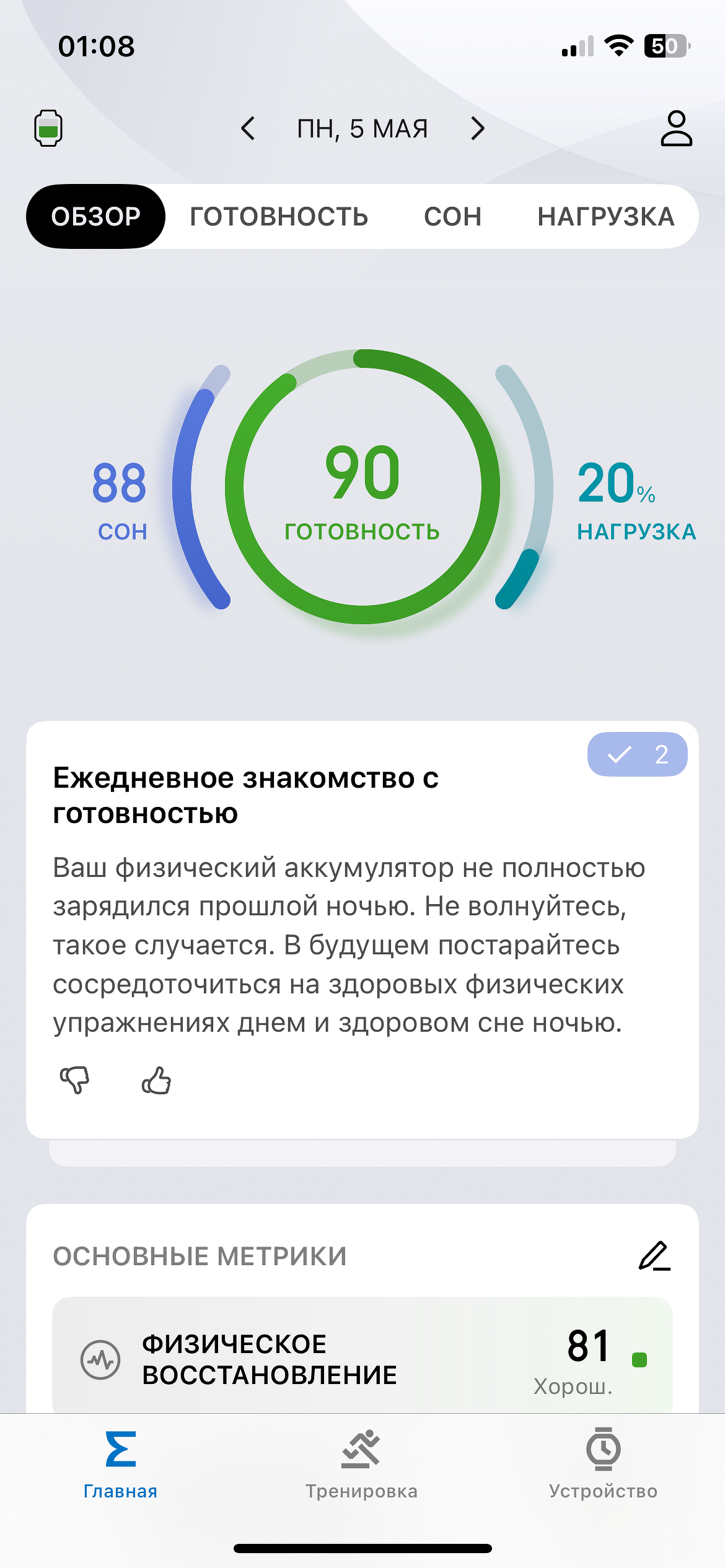 Из необычного — система оценивает в баллах физическое и психическое восстановление, а также тренировочную форму. Кроме того, есть параметр под названием «Готовность» — он рассчитывается утром после сна и показывает в целом состояние пользователя. Любопытно, что были ситуации, когда система посчитала готовность максимальной — и действительно, в эти дни ощущалась достаточно высокая бодрость.