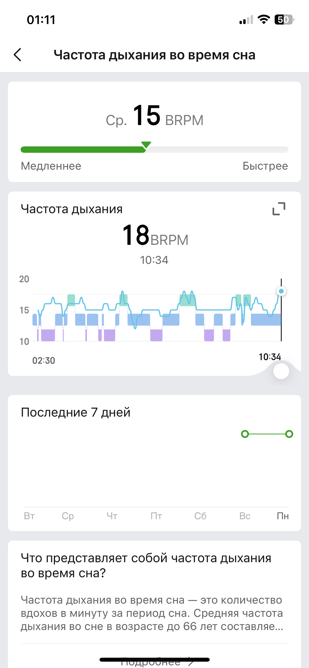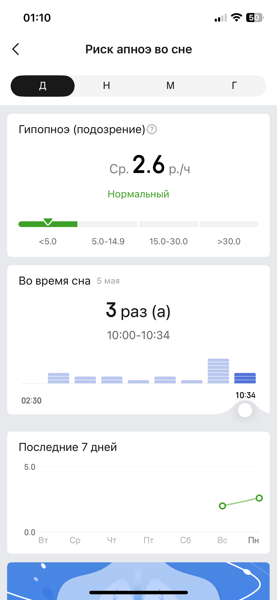 Есть разбивка по фазам сна, ночные пробуждения тоже видны. Также определяется риск апноэ — кратковременных остановок дыхания во сне, которые могут быть опасны.