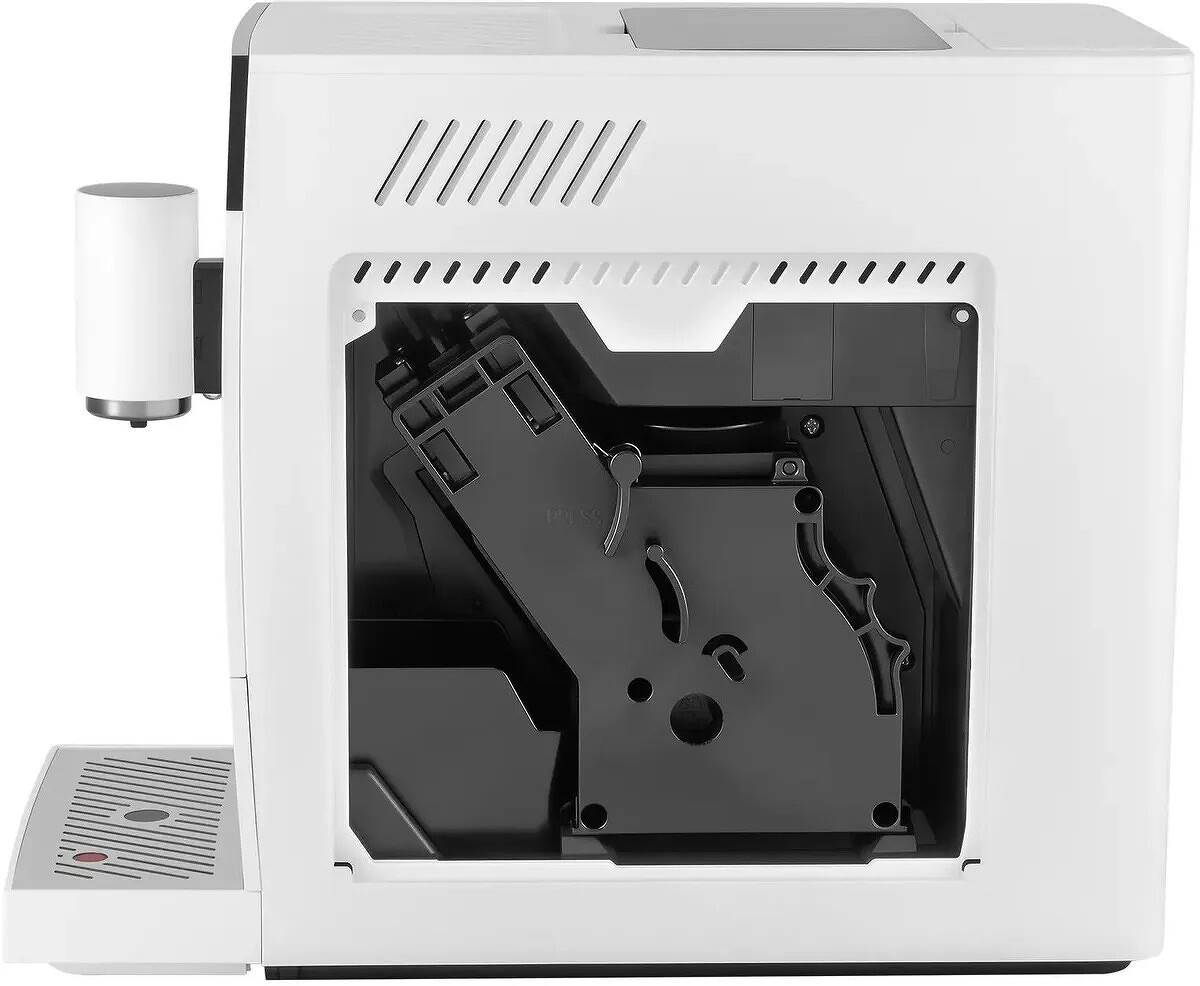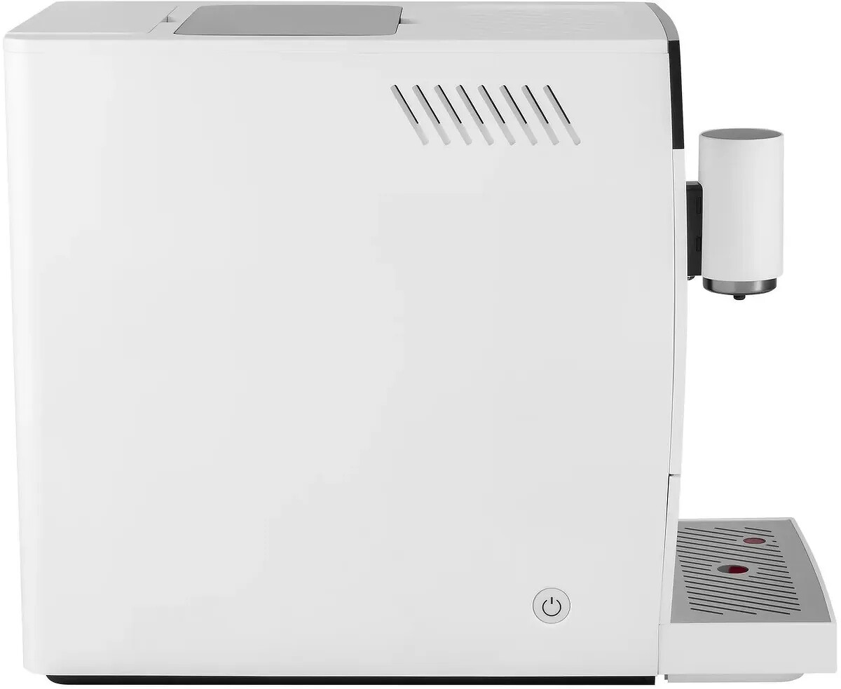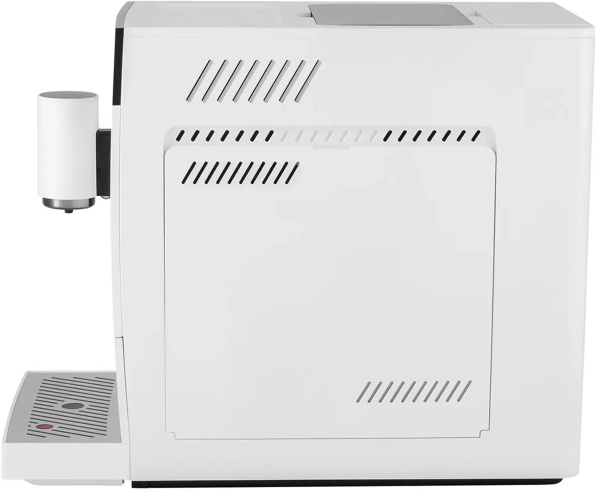 Корпус кофемашины изготовлен из пластика, устойчивого к появлению отпечатков пальцев и мелких царапин. Устройство представлено в белом цвете с небольшими черными элементами в виде сенсорной панели управления с дисплеем и крышки резервуара для кофейных зерен.