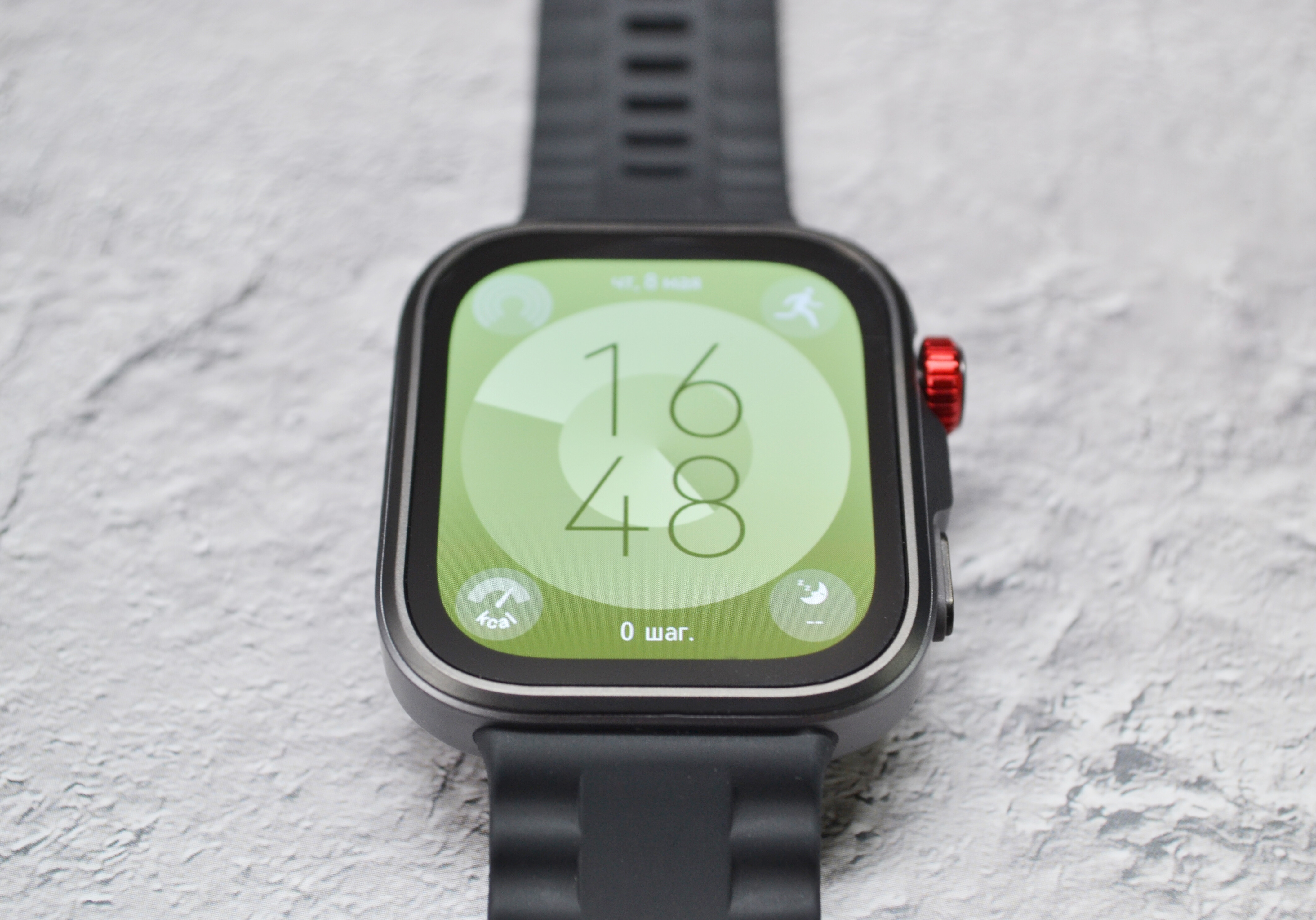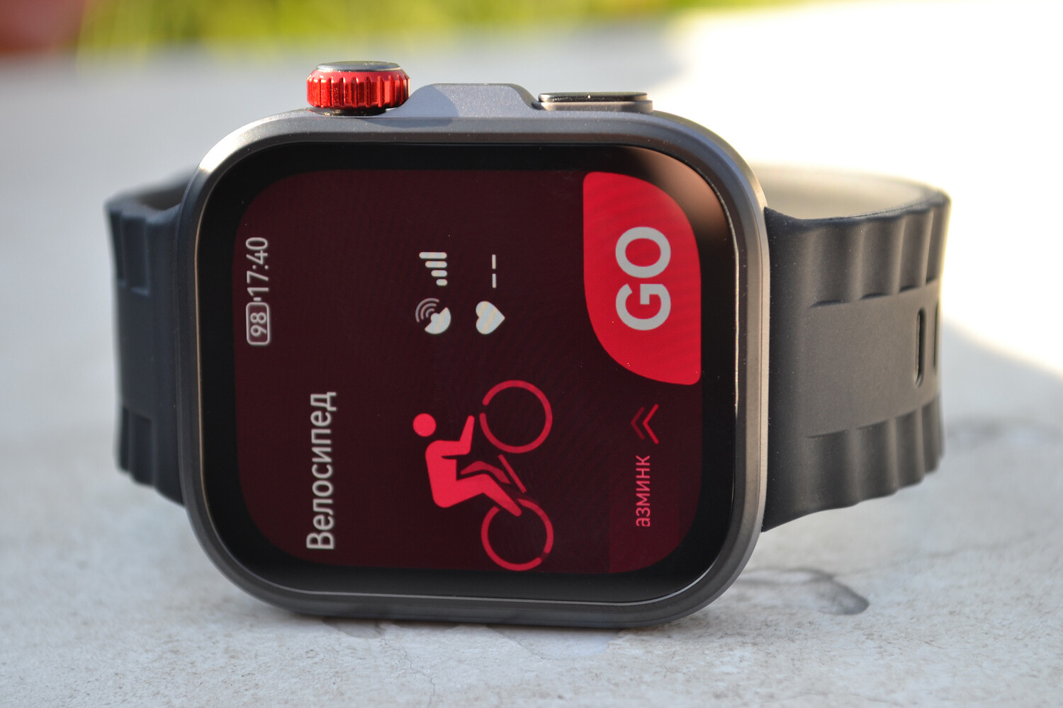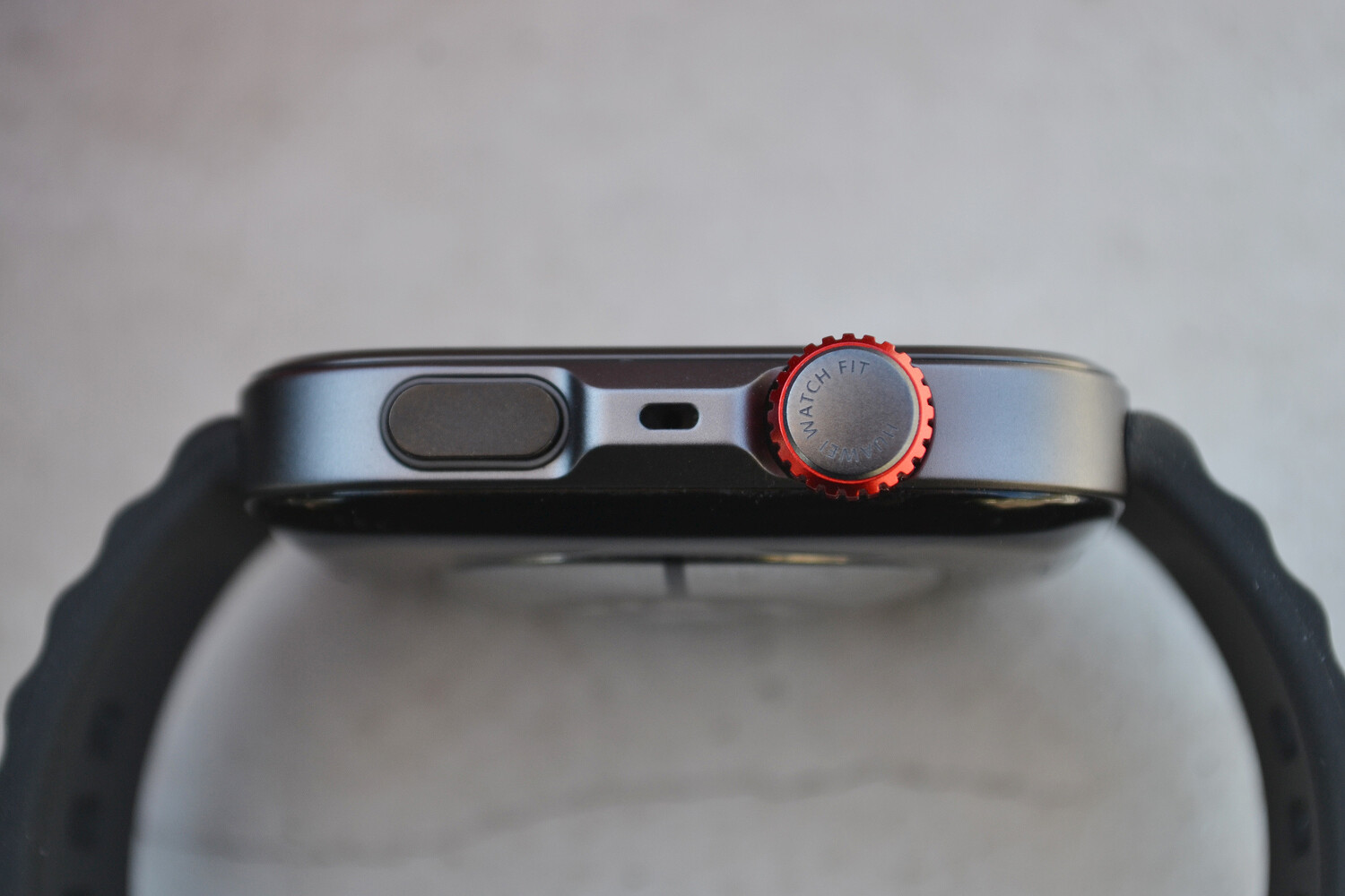 Вращающаяся «заводная головка» справа выкрашена в красный цвет, ее приятно крутить из-за тактильной отдачи, она двигается непрерывно. Расположенная под ней боковая кнопка запрограммирована на быструю активацию отслеживания тренировок.