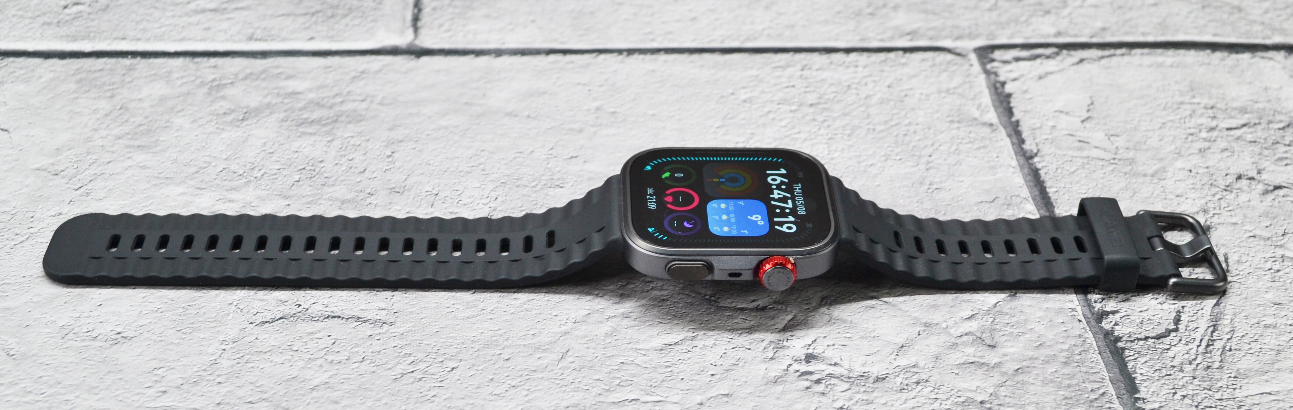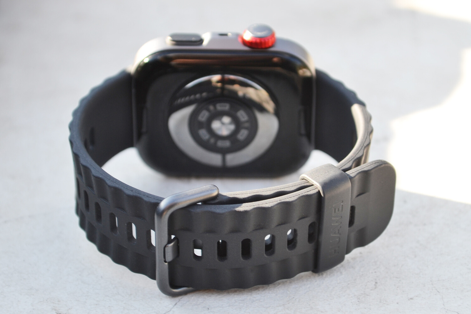 На выбор предлагается три ремешка для часов. У нас на тестировании был образец с ремешком черного цвета из фторэластомера. Ремешок очень мягкий, плотно облегает руку и идеально подгоняется под запястье. Но есть нюанс — материал буквально притягивает к себе пыль и ворсинки с одежды.