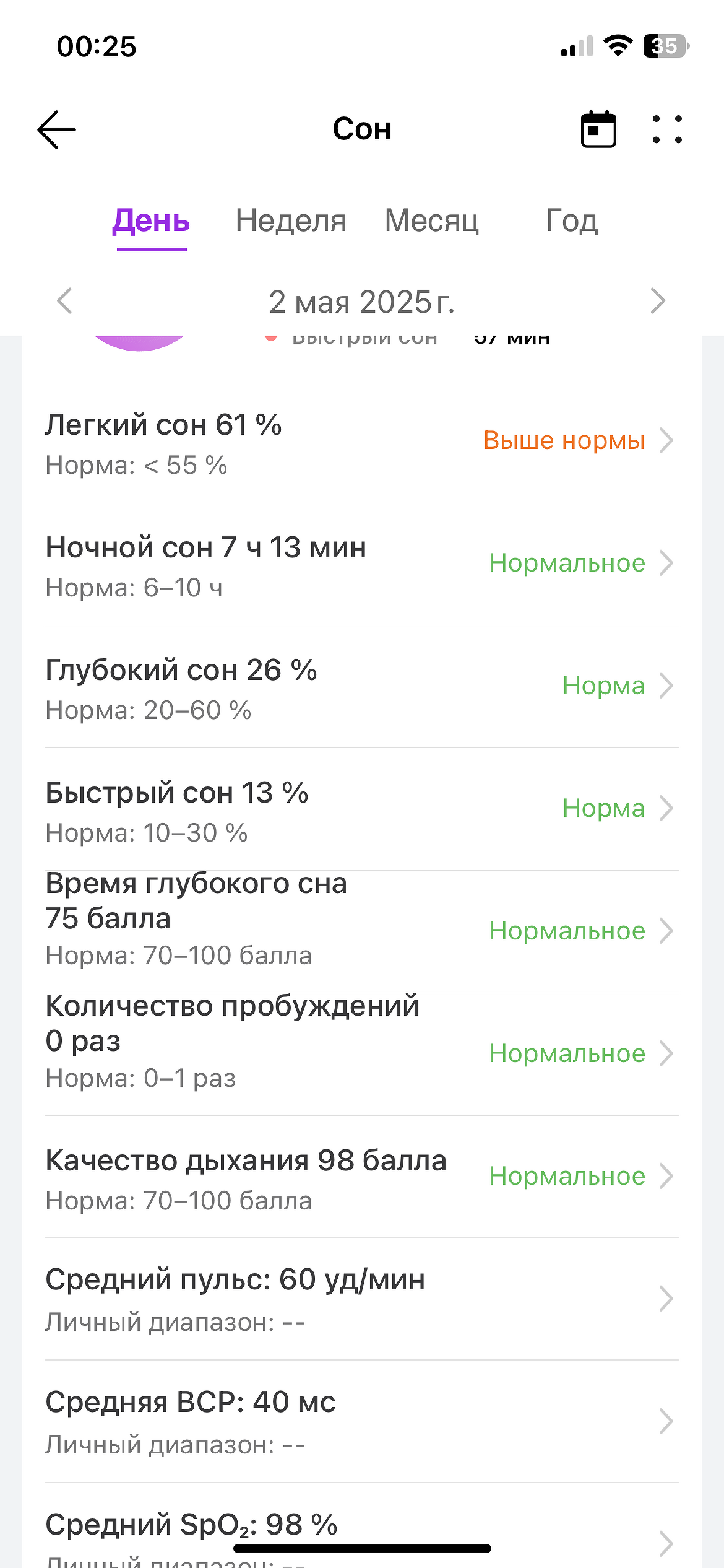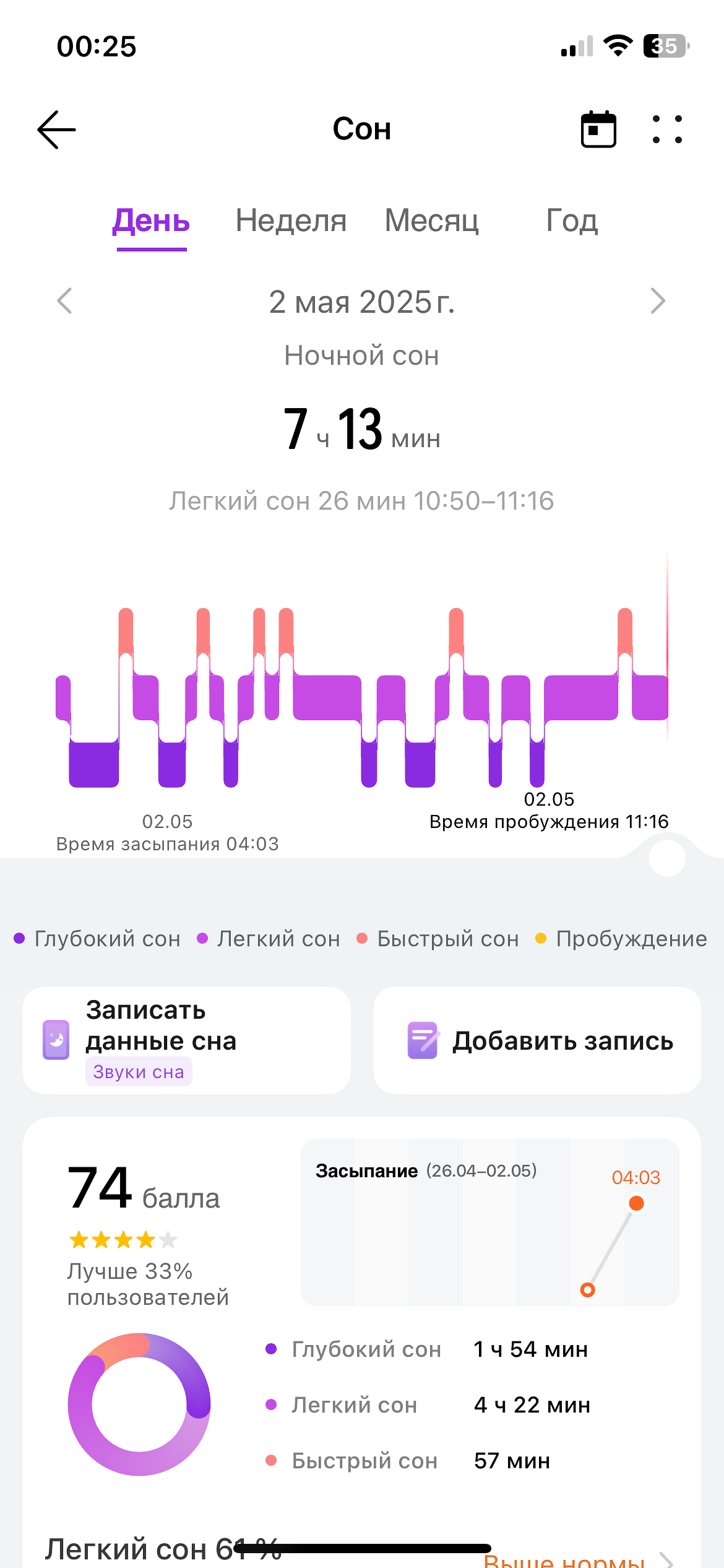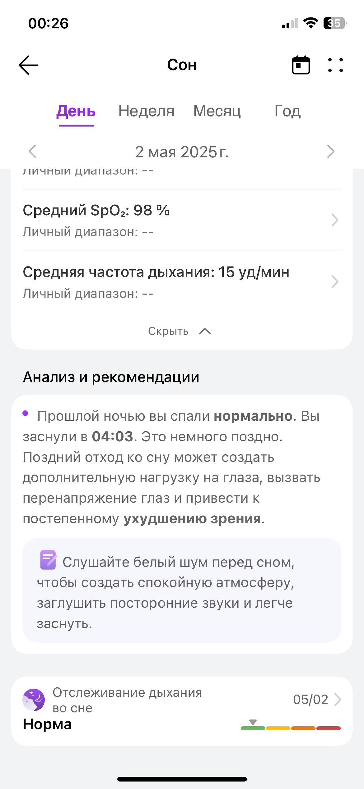 Мониторинг сна, как обычно, достаточно точный, рекомендации — строго научно обоснованные, фазы сна отслеживаются, по нашим ощущениям, правильно. Время подъема и засыпания тоже.
