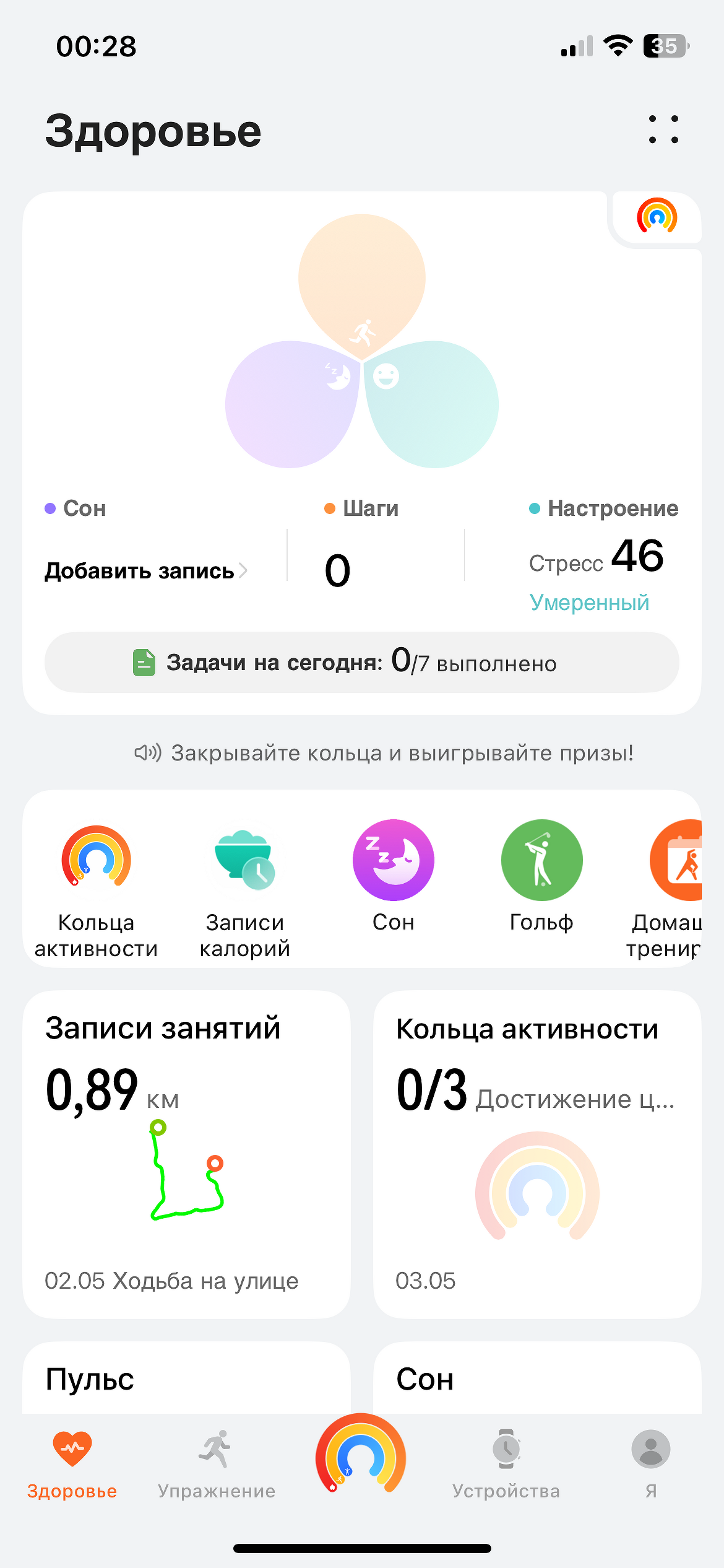 Для мониторинга тренировок в HUAWEI WATCH FIT 4 Pro все продумано до мелочей: поддерживается более 100 различных видов спорта и активностей. Из интересного отметим подробный мониторинг некоторых видов тренировок. Тут есть отдельный режим гольфа с возможностью загрузки карты гольф-поля, отслеживания расстояния грина и препятствий. Можно активировать режим драйвинг-рейнджа, когда вы тренируетесь для отработки дальних ударов.