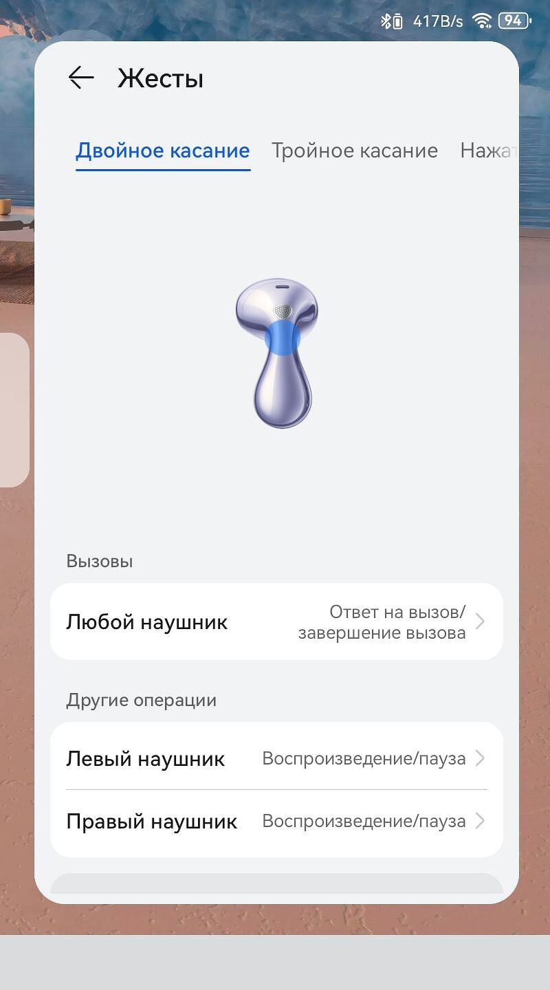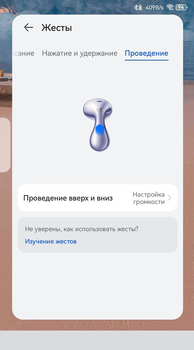 Каждый из наушников может поддерживать свой набор жестов. Такие действия как свайп, долгое удержание пальца на ножке, а также свайпы по поверхности можно настроить самостоятельно. Так, например, можно установить проигрывание и остановку композиций только на одном наушнике, а перемотку — на другом.