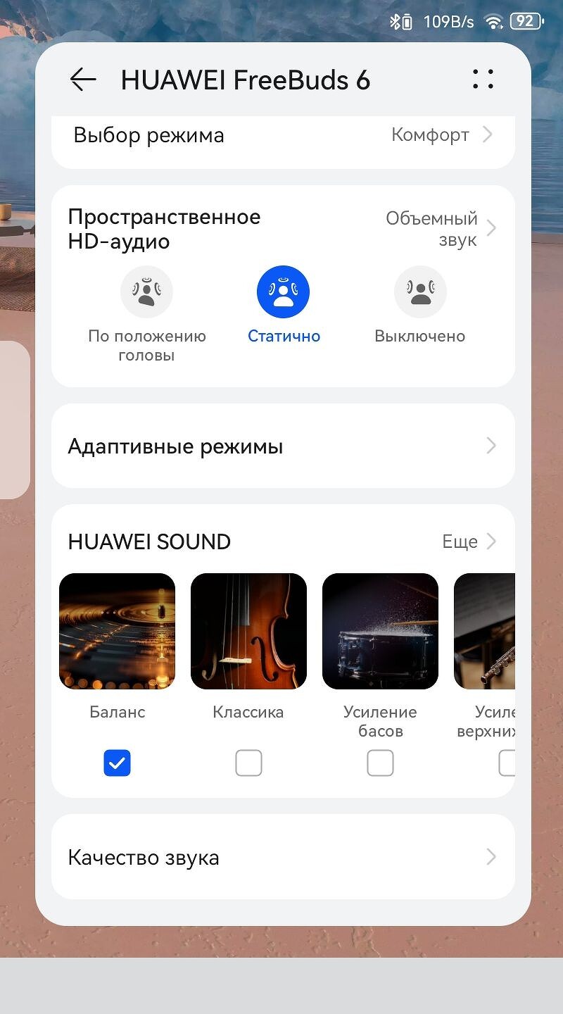 Звук у FreeBuds 6 — на достойном уровне. Заявленный диапазон — от глубоких низких (вплоть до 14 Гц) до недоступных человеческому восприятию 48 кГц. Используется двойная система с четырьмя магнитами: 11-миллиметровый динамический драйвер предназначен для воспроизведения басов и низкой середины, а ультратонкий плоский твитер отвечает за высокие частоты.