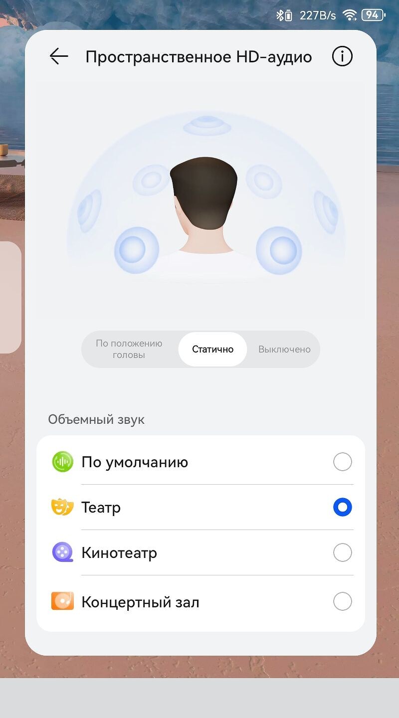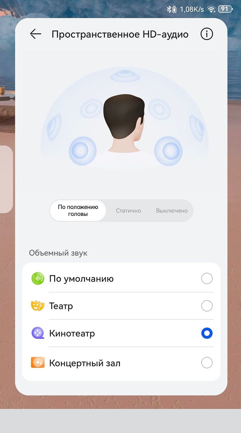Приложение поддерживает Head Tracking Spatial Audio, но работает только с некоторыми телефонами Huawei и собственным приложением HUAWEI Music. Это довольно забавный аудио-аттракцион, когда меняя положение головы, меняется и пространственная аудиокартина, как будто слушатель находится в концертном зале, клубной площадке или кинотеатре, а при повороте направо, оркестр или певец как бы перекочевывают в левый наушник и наоборот.