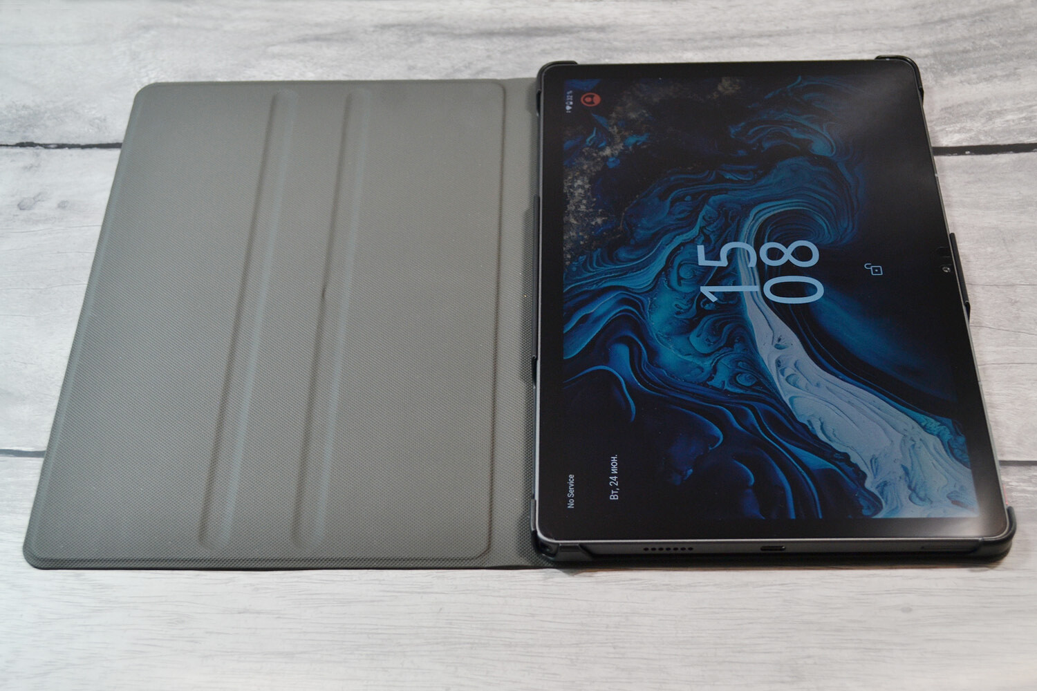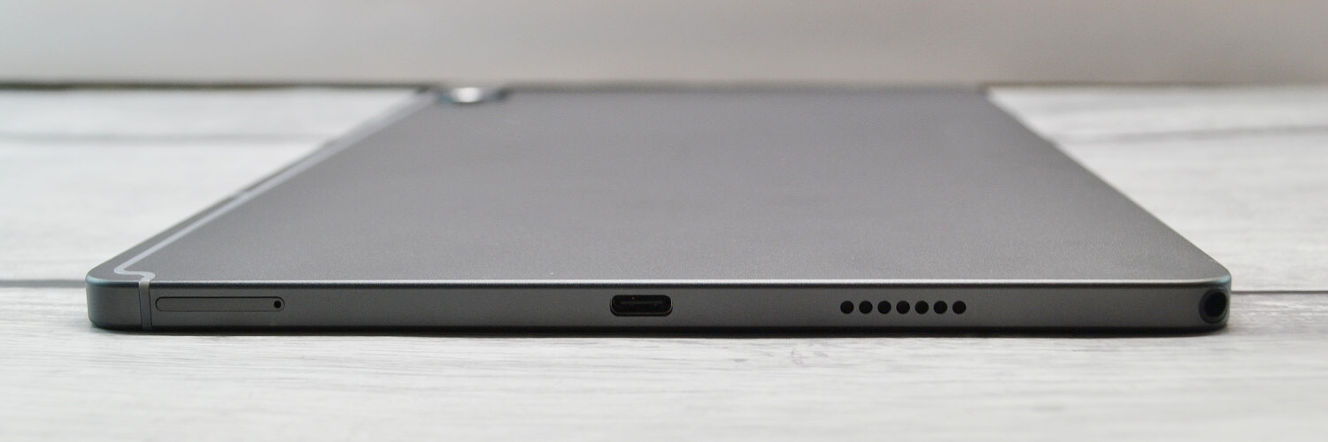 Разъем для зарядки USB Type-C расположился на правом торце (если разместить планшет в альбомной ориентации), здесь же на самом углу — миниджек для наушников. На этом же торце находится лоток для SIM-карты и microSD.