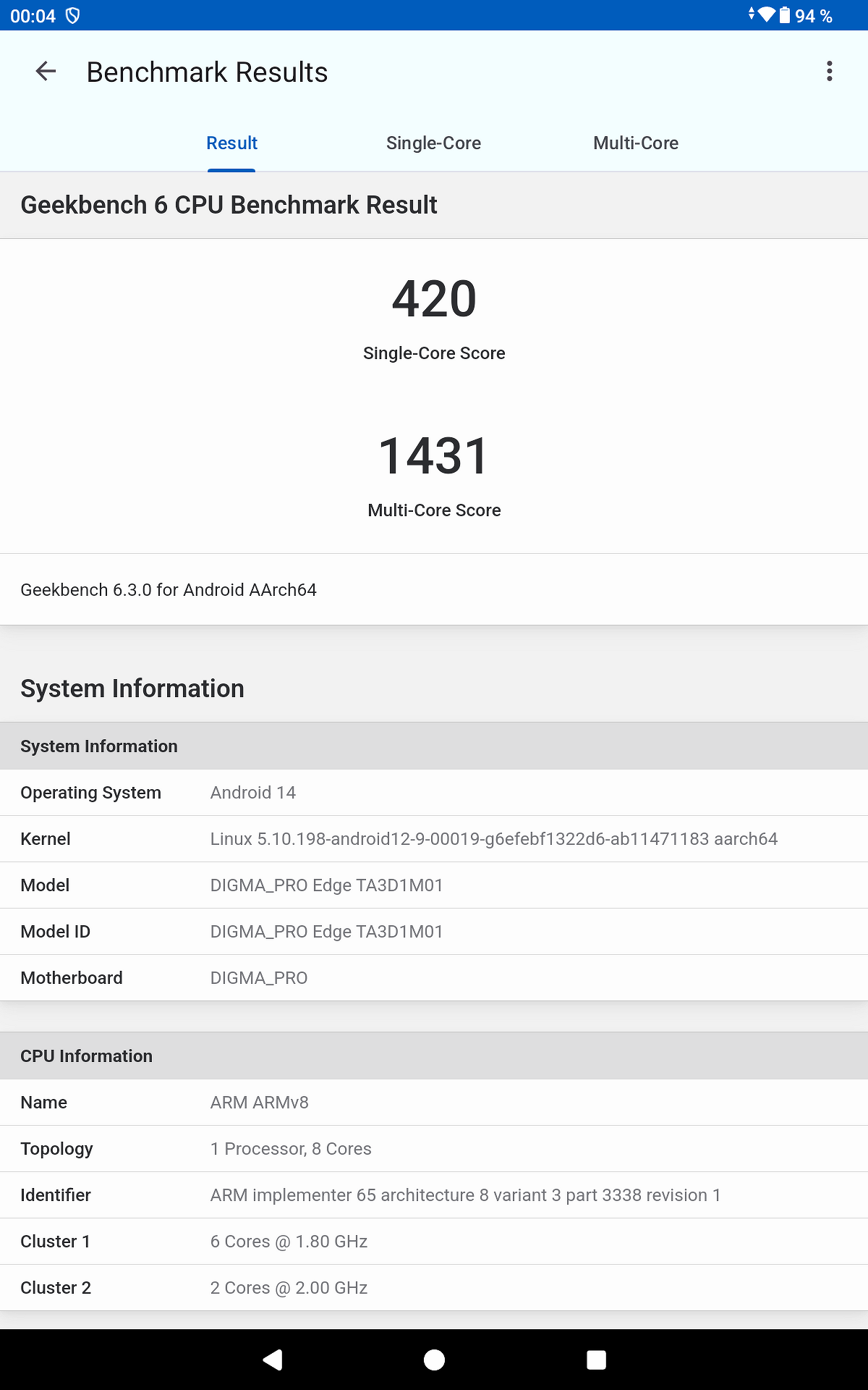Результаты бенчмарков ожидаемые: так, в Antutu планшет выдает 259 432 «попугая», в GeekBench 6 — 420 и 1431 балла в одноядерном и многоядерном тесте соответственно.