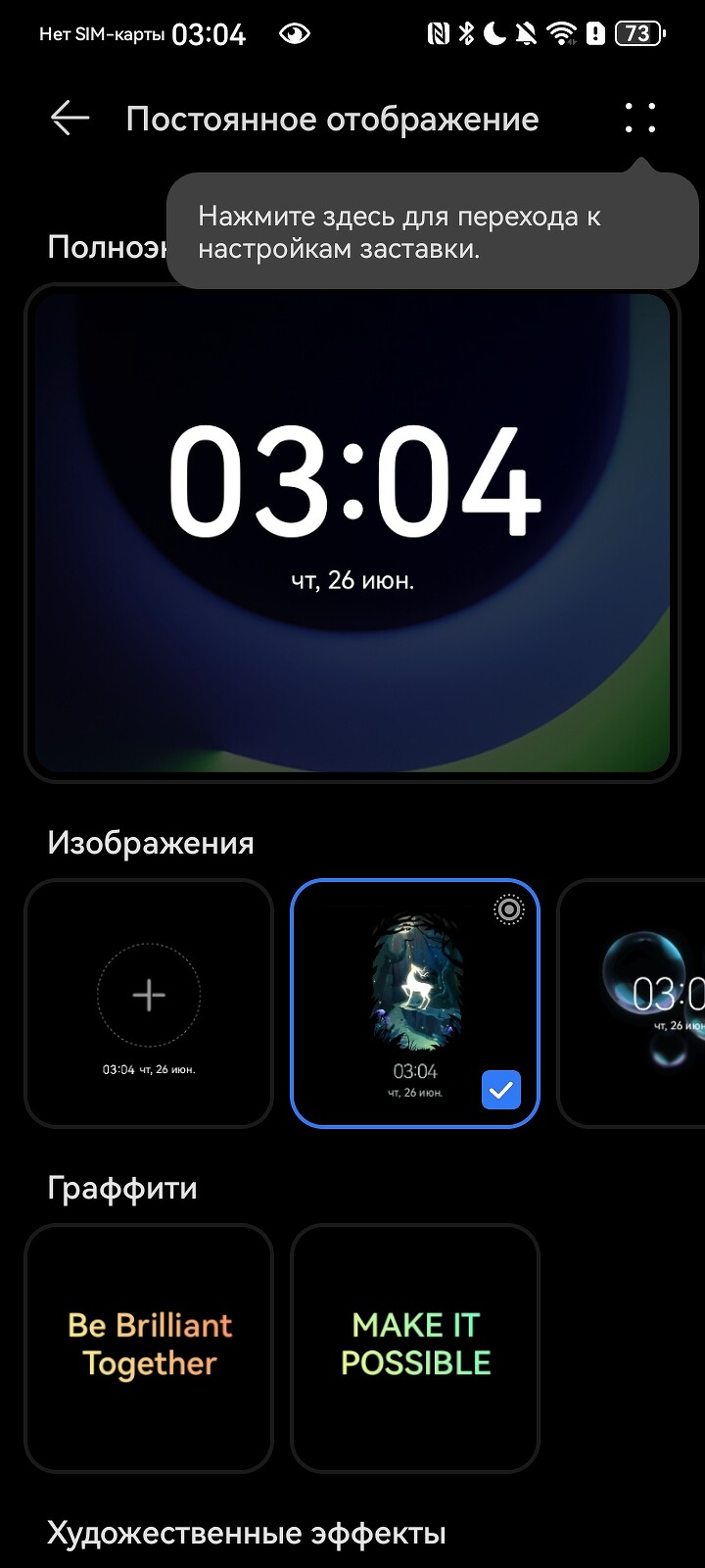 А еще тут есть урезанный Always-on-display, характерный чаще для AMOLED-экранов. Заставка предполагает демонстрацию текущего времени, даты, уровня заряда аккумулятора с настраиваемой картинкой. В нашем случае режим урезан, так как заставка появляется лишь при касании экрана — все-таки это IPS, стоит поберечь батарею.