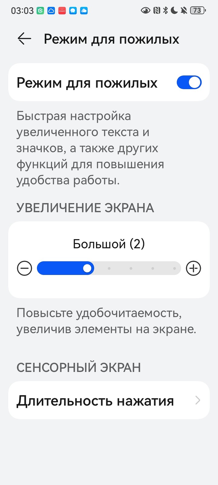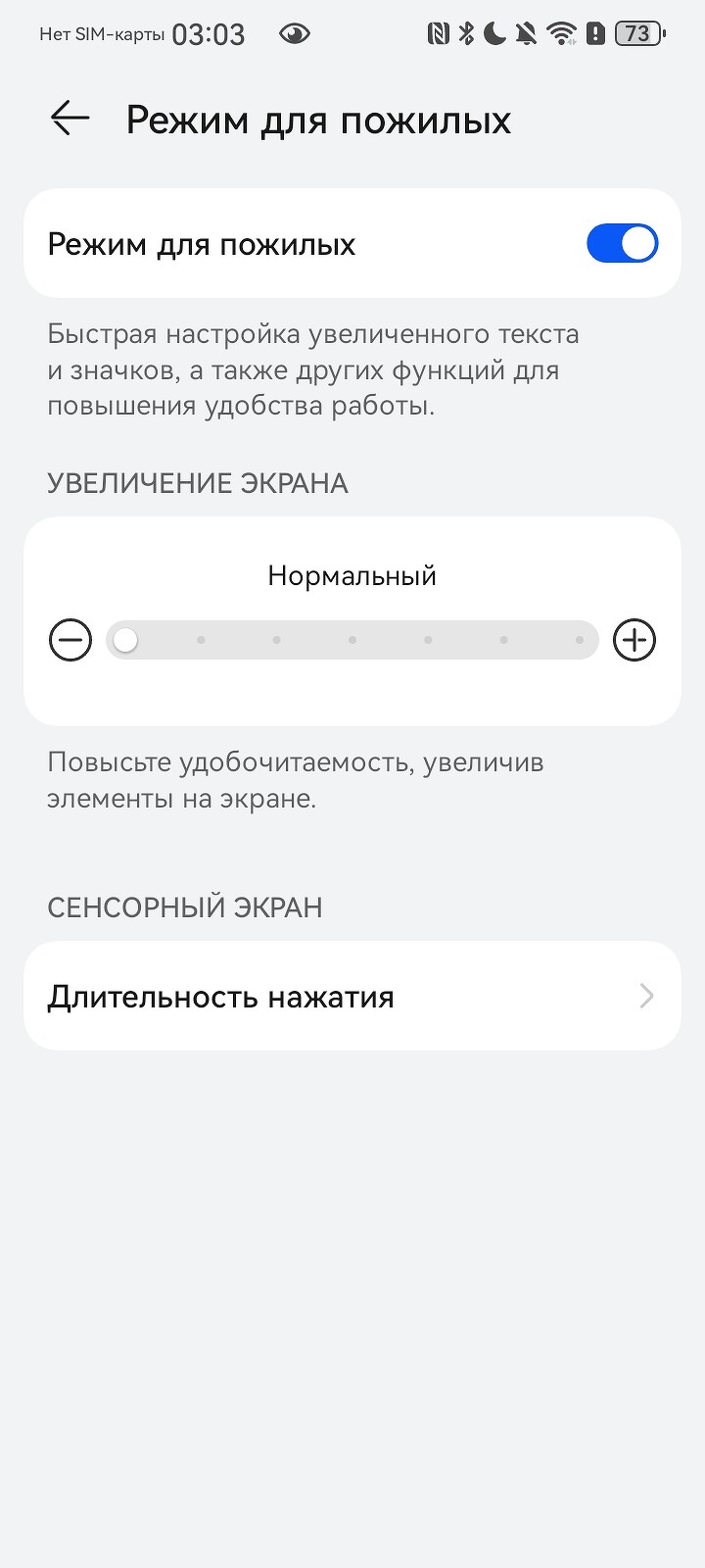 Свойственные смартфонам HUAWEI фишки тоже есть: режим электронной книги, режим защиты зрения от синего света и мерцания (у смартфона есть сертификат SGS Switzerland), а также специальный режим для пожилых. Доступные гаджеты часто покупают для старшего поколения, и этот режим предполагает увеличение размера иконок со шрифтами и распознавание длительности нажатия. Довольно удобно активировать эти настройки буквально за пару движений, а не искать нужные параметры в меню.