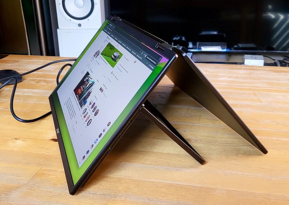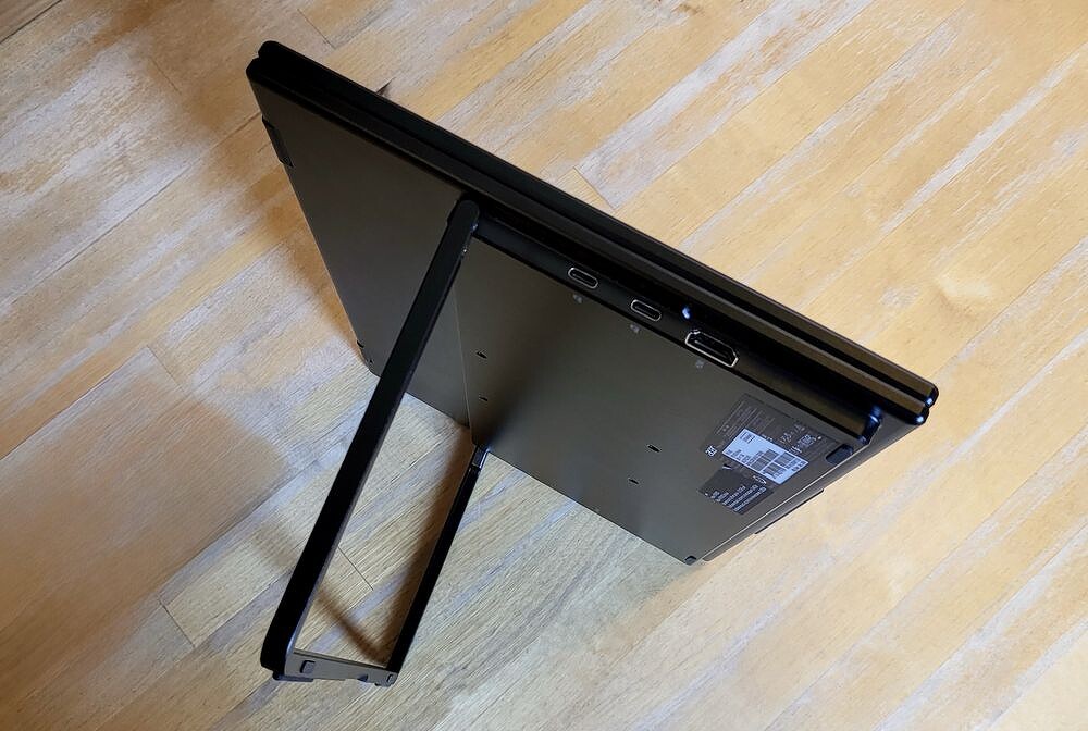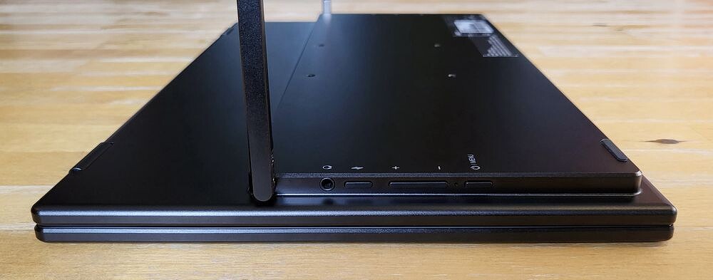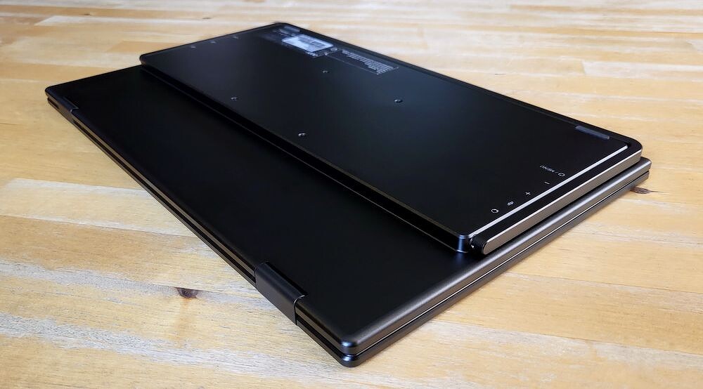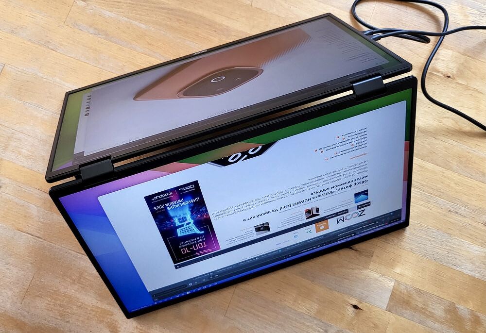 Устройство — это две IPS матрицы, обрамленные привычными ноутбучными рамками c разрешением FullHD (1920 x 1080). Суммарно — почти 2160Ч1080, то есть идеальный дисплей, который можно раскрыть до 315° для работы с несколькими окнами, длинными документами или презентациями.