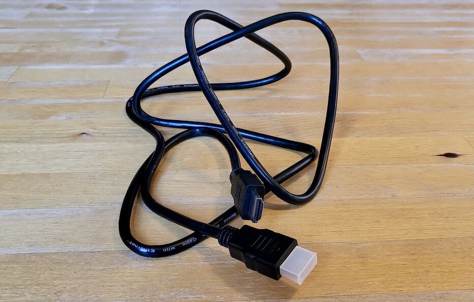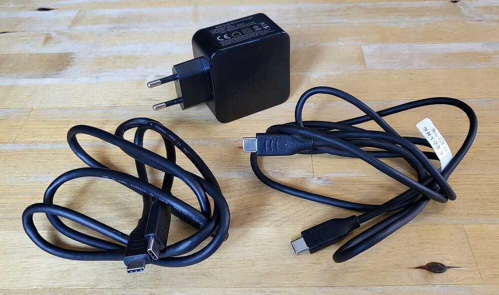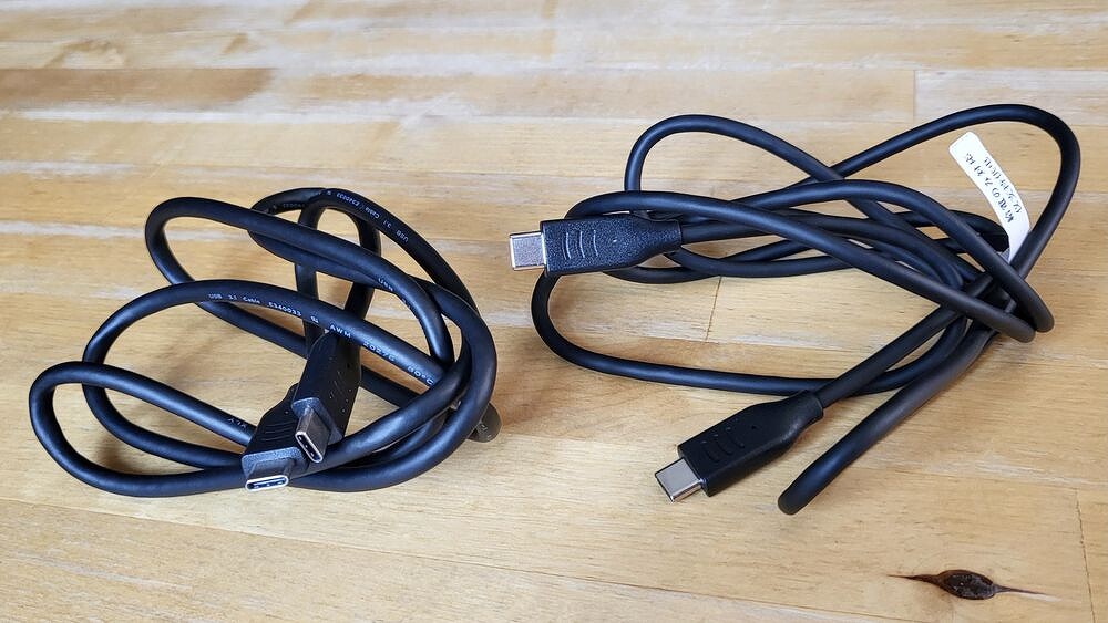 В комплекте идут два провода USB Type C — USB Type C. Один из них предназначен сугубо для питания устройства, о чем предупреждает бирка со строгим указанием, что видео по нему передаваться не будет. Также в комплекте идет довольно длинный провод HDMI - HDMI.