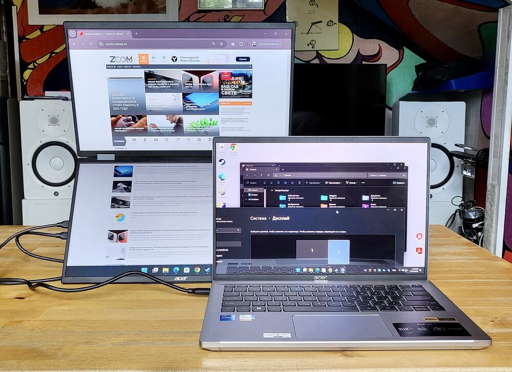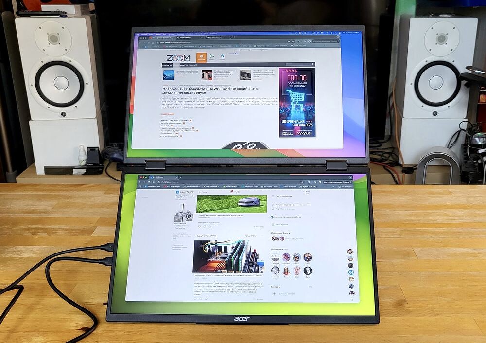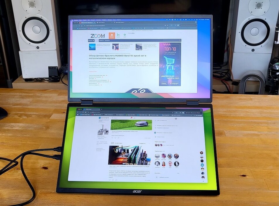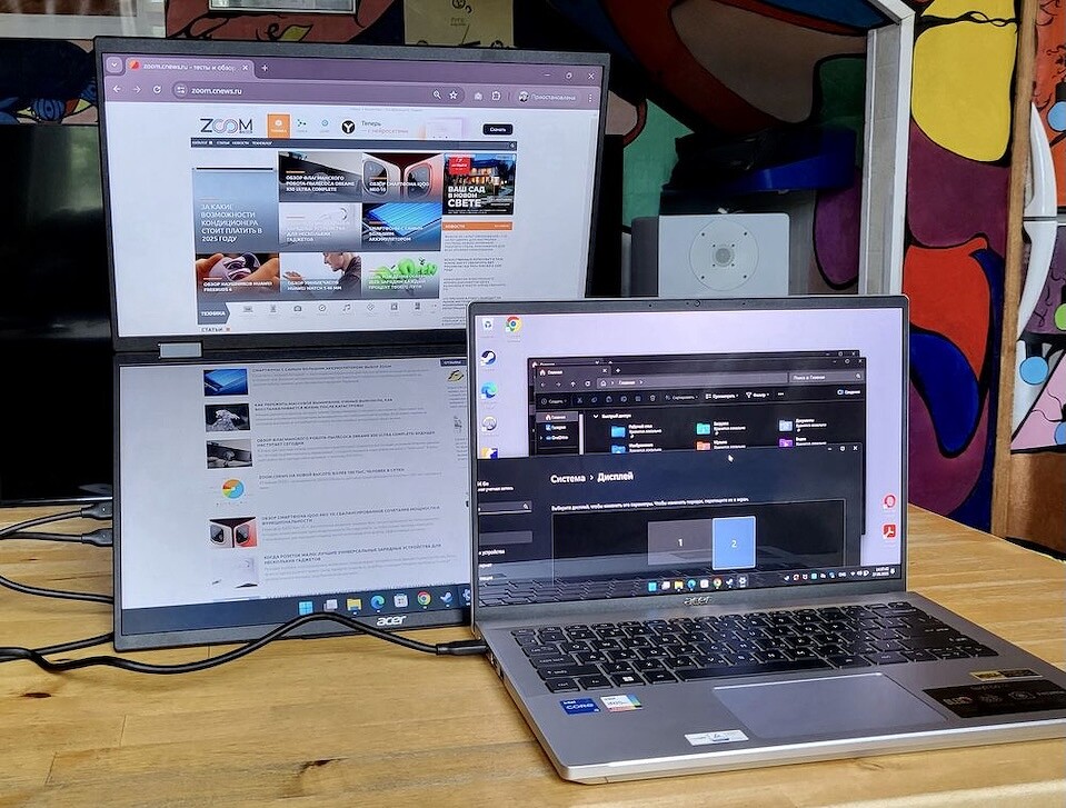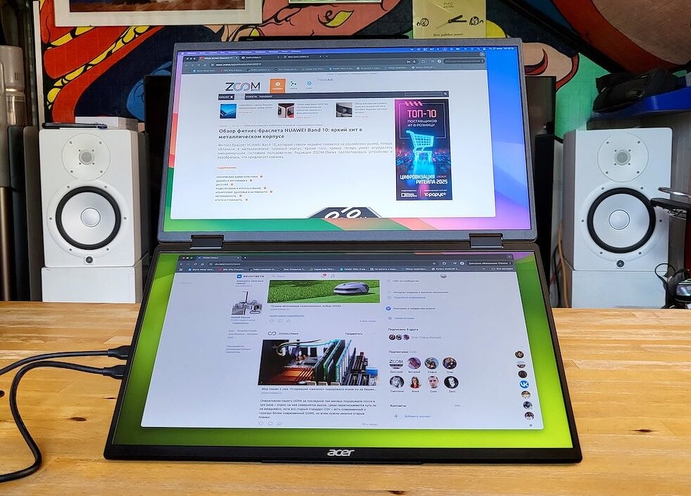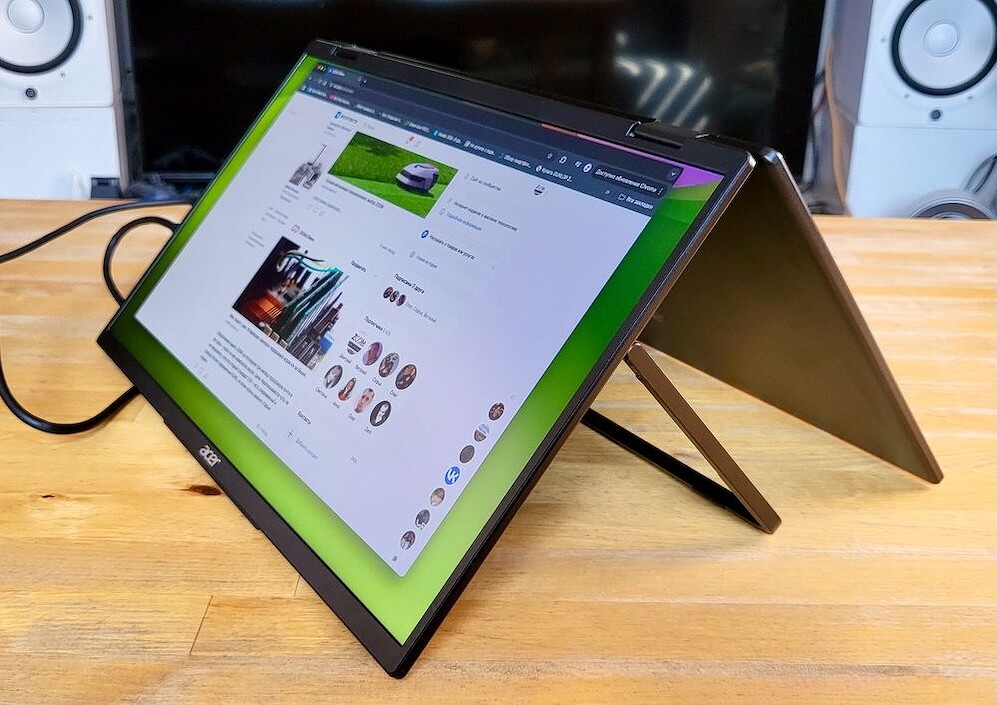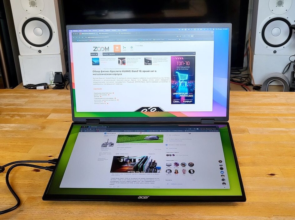 Их монитор весит не больше, чем современный ноутбук, остаётся достаточно тонким и компактным, но предлагает не один, а два полноценных дисплея — и это стоит того! Он превращает любую ровную поверхность в настоящее рабочее место с тремя экранами. При этом подкупают простота и универсальность решения. Не нужно задумываться, как подключить, где разместить, какие кабели подобрать — всё уже есть в комплекте.