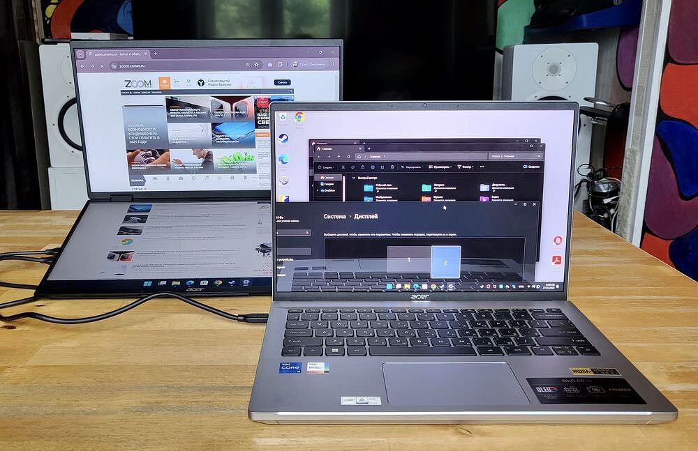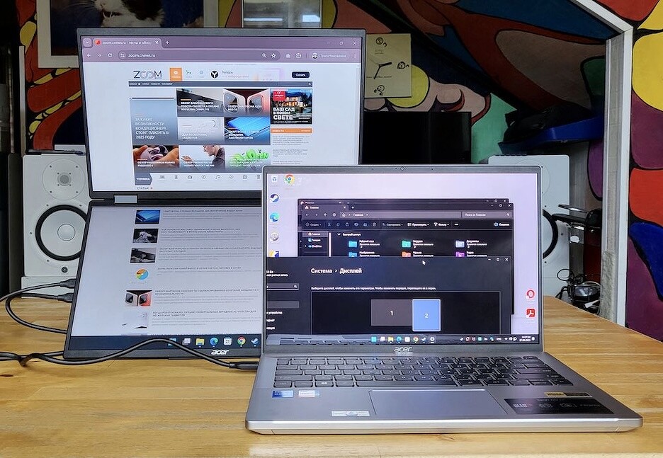 И все же одна проблема остается — чем компактнее ноутбук, тем меньше размер экрана. А ведь иногда нужно прямо «развернуться»: показать масштабный эскиз, диаграмму рассмотреть, чтобы столбцы отчета не сливались в частокол палочек с невнятными подписями. В этом случае есть следующие варианты: внешний стационарный монитор, телевизор приличной диагонали или проектор. Вполне удобно для переговорки или коворкинга, которые подготовлены для офисных задач. А если работа или встреча проходят в кафе или в купе поезда? Тогда точно пригодится внешний мобильный экран. Этот класс устройств уже давно обзавелся армией поклонников среди мобильных пользователей и обладает огромным парком привычных предложений.