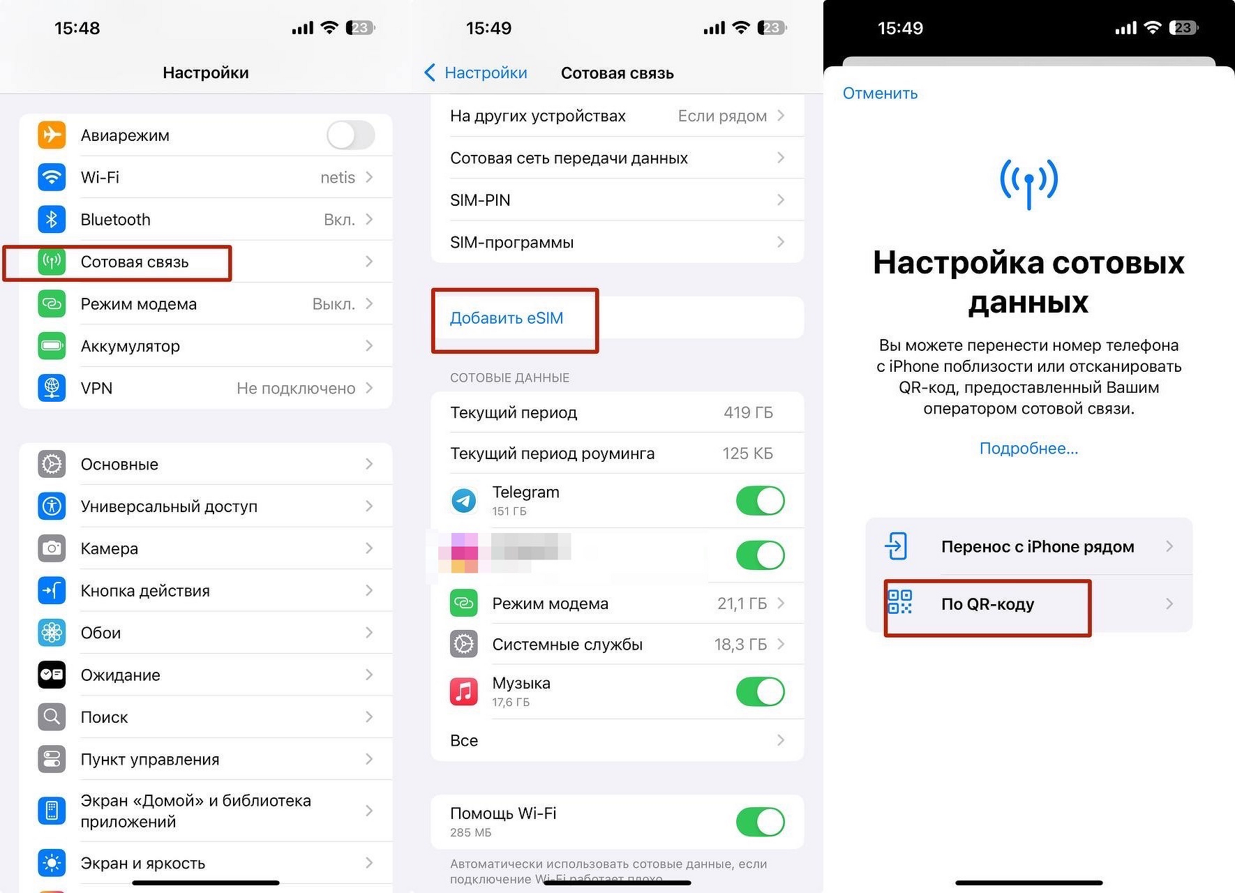 Для того, чтобы настроить eSIM на iOS, необходимо войти в «Настройки», выбрать раздел «Сотовая связь», затем кликнуть на «Добавить eSIM» выбрать «По QR-коду».
