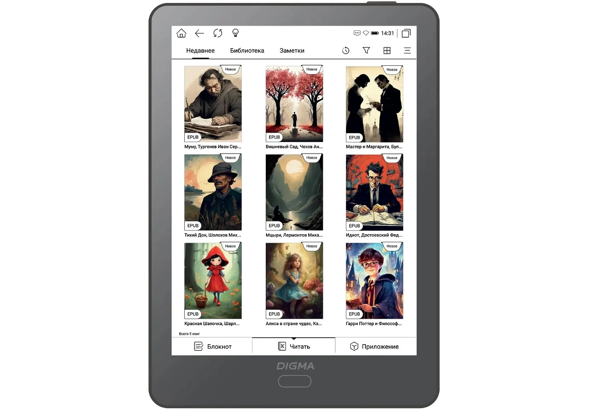 Digma P6 — электронная книга на базе Kaleido с поддержкой 4096 цветов и подсветкой. Такой экран лишен мерцания и бликов, а аккумулятор тратит энергию только на листание страниц, потому его хватает на неделю или больше.