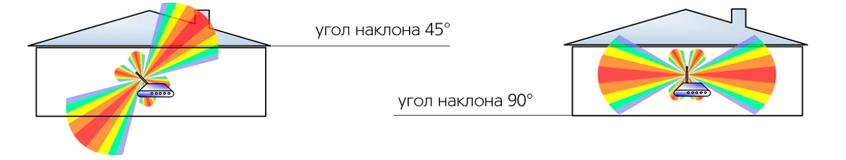 В роутере наиболее мощный сигнал идет перпендикулярно оси антенны