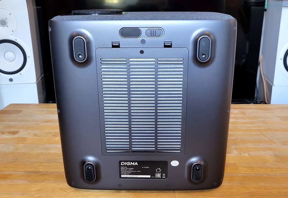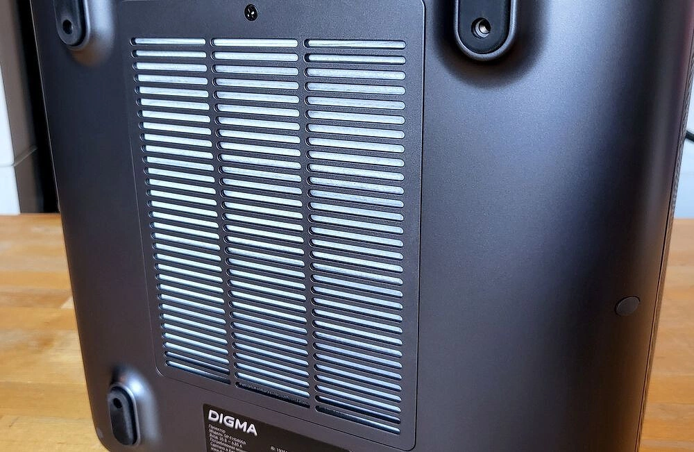 Проектор DIGMA DP-FHD800A располагает двумя встроенными динамиками мощностью по 15 Вт. Звук получается достаточно объёмным, с заметным запасом по громкости, особенно для средних помещений — до 20–25 мІ. Просмотр фильмов, игры или стриминг аудио — это вполне по плечу встроенной системе. В проекторе предусмотрена функция, когда он сам может выступать в роли Bluetooth колонки.