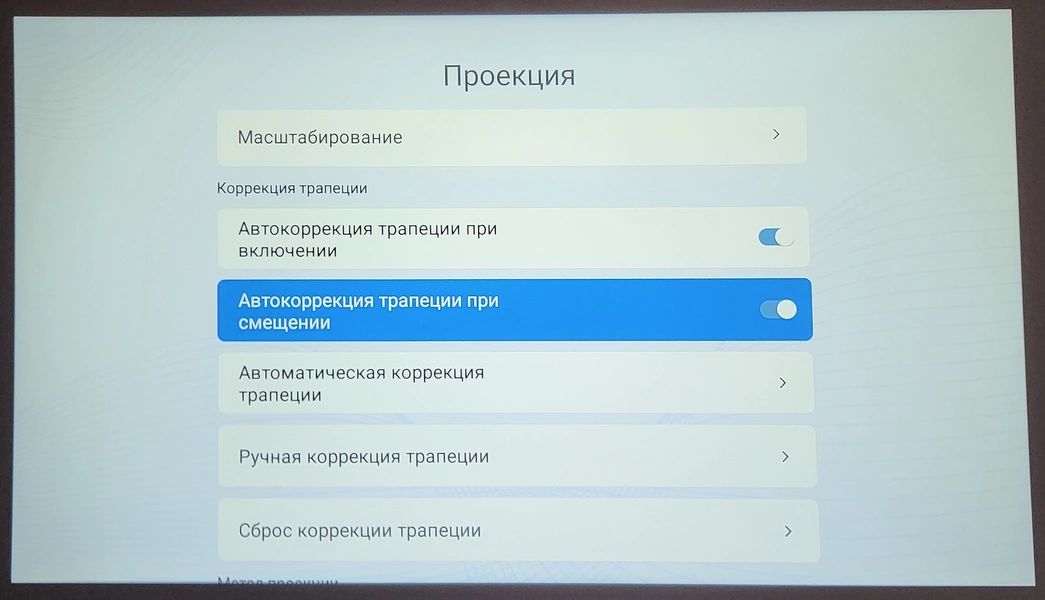 На пульте ДУ есть специальная кнопка, которая запускает автоматический процесс коррекции и настройки фокуса при помощи встроенной камеры. При этом моторизованная ручная регулировка позволяет тонко подстроить резкость, а цифровая коррекция трапецеидальных искажений (4P/4D) обеспечивает правильную геометрию даже при диагональном положении устройства относительно плоскости проекции. Коррекция горизонтальных и вертикальных трапецеидальных искажений происходит в диапазоне + 15 / - 15 °.