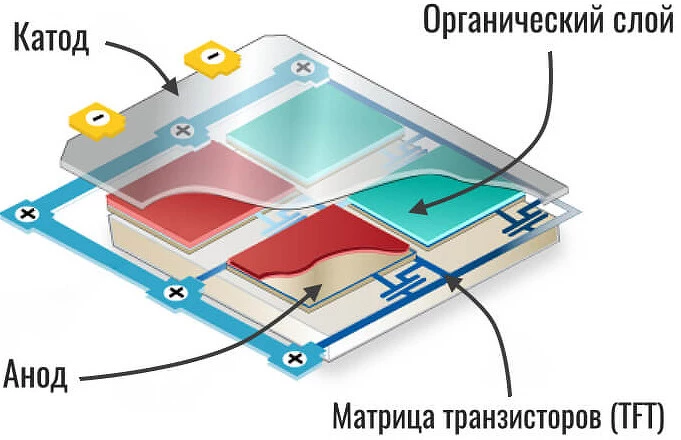 Одной из разновидностей OLED является AMOLED, где к светодиодам добавлена активная матрица управления. Но в современных телевизорах и смартфонах и так используется только активная матрица, поэтому различие между OLED и AMOLED носит больше терминологический характер, чем реальный.