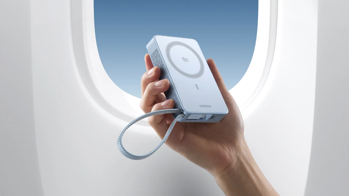 Внешний аккумулятор имеет дисплей на торце, отображающий оставшийся заряд в процентах. В роли транспортировочного шнурка выступает кабель питания USB Type-C в прочной тканевой оплетке. Емкость встроенного аккумулятора — 10 000 мА·ч. Пауэрбанк зарядит iPhone 17 Pro Max до 50% примерно за 38 мин.
