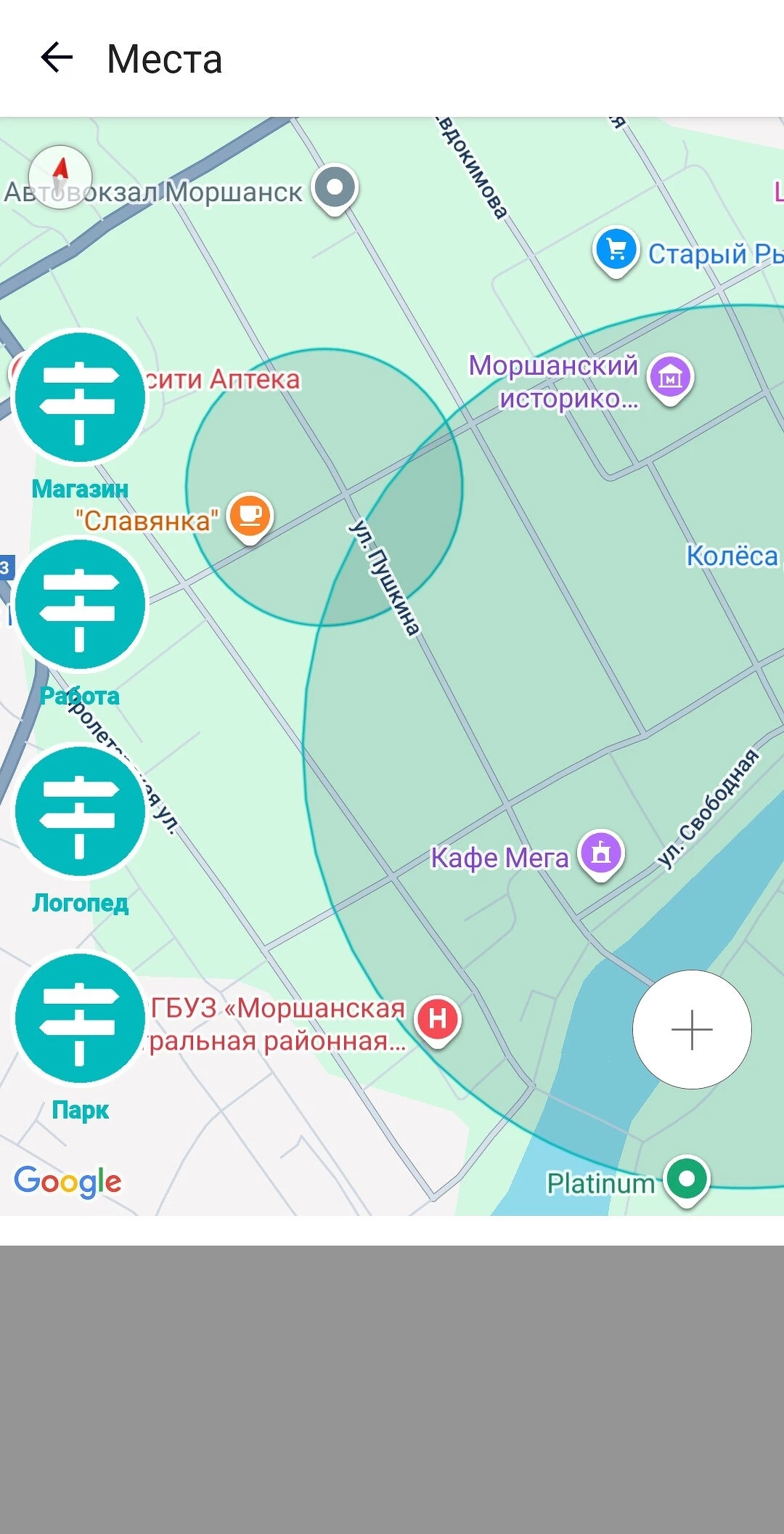 Также в "Семейный локатор — Локатор 24" есть возмозможность добавлять геозоны. Это виртуальные области на карте или конкретные места, которые часто посещают пользователи группы. Например, школа, работа, магазин, спортзал и так далее. Геозоны позволяют контролировать перемещение пользователя, соблюдение им маршрута.