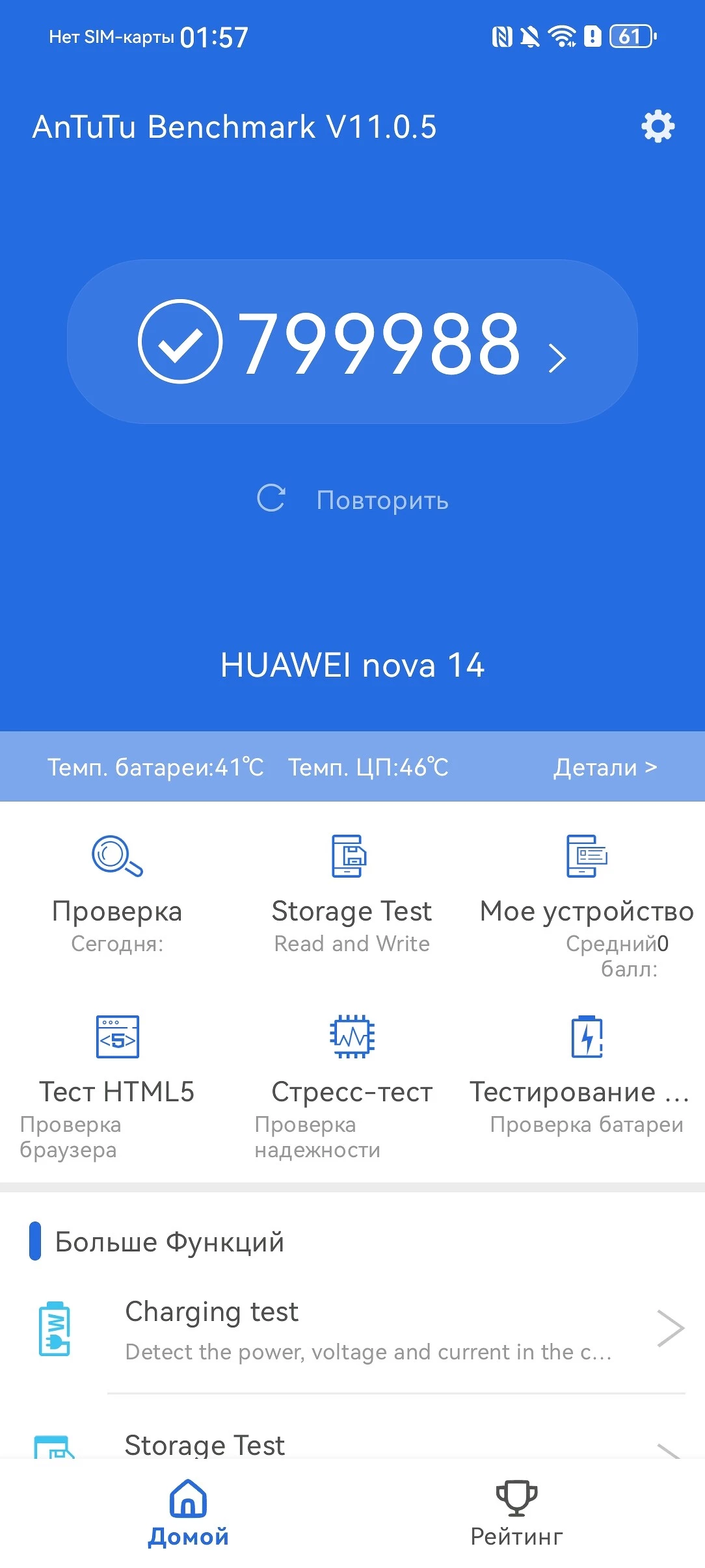 В HUAWEI nova 14 используется аккумулятор емкостью 5500 мАч — стандартная емкость для смартфонов этого сегмента. В базовых сценариях без активации режима энергосбережения (чтение, воспроизведение видео, просмотр фото, немного несложных игр, включенный Wi-Fi, средняя яркость экрана) устройство спокойно выдерживает полный день, а то и сутки.