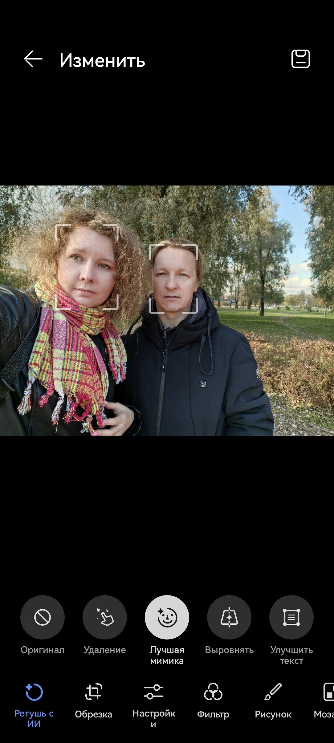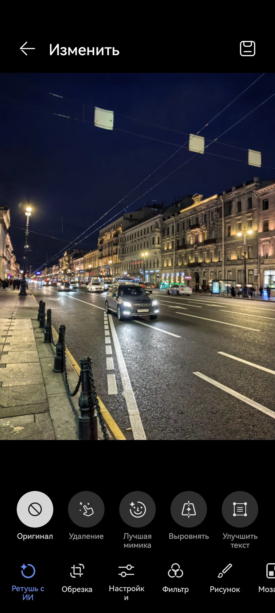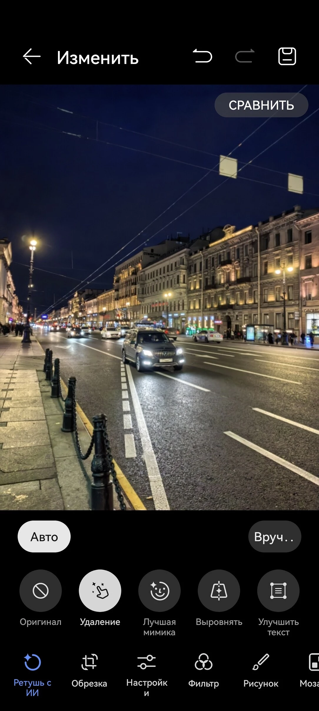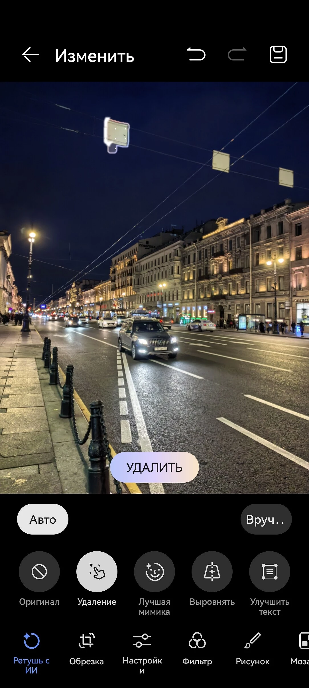 Отдельно пройдем по ИИ-возможностям, которые реализованы в HUAWEI nova 14. Во-первых, в галерее можно при редактировании фото убрать лишние детали из кадра или сделать быструю ретушь. Удаление объектов нам особенно понравилось: просто выбираем «Удаление» в пункте «Ретушь с ИИ», выделяем предмет, жмем «Удалить» и ждем, пока ИИ дорисует кадр уже без нашего объекта.