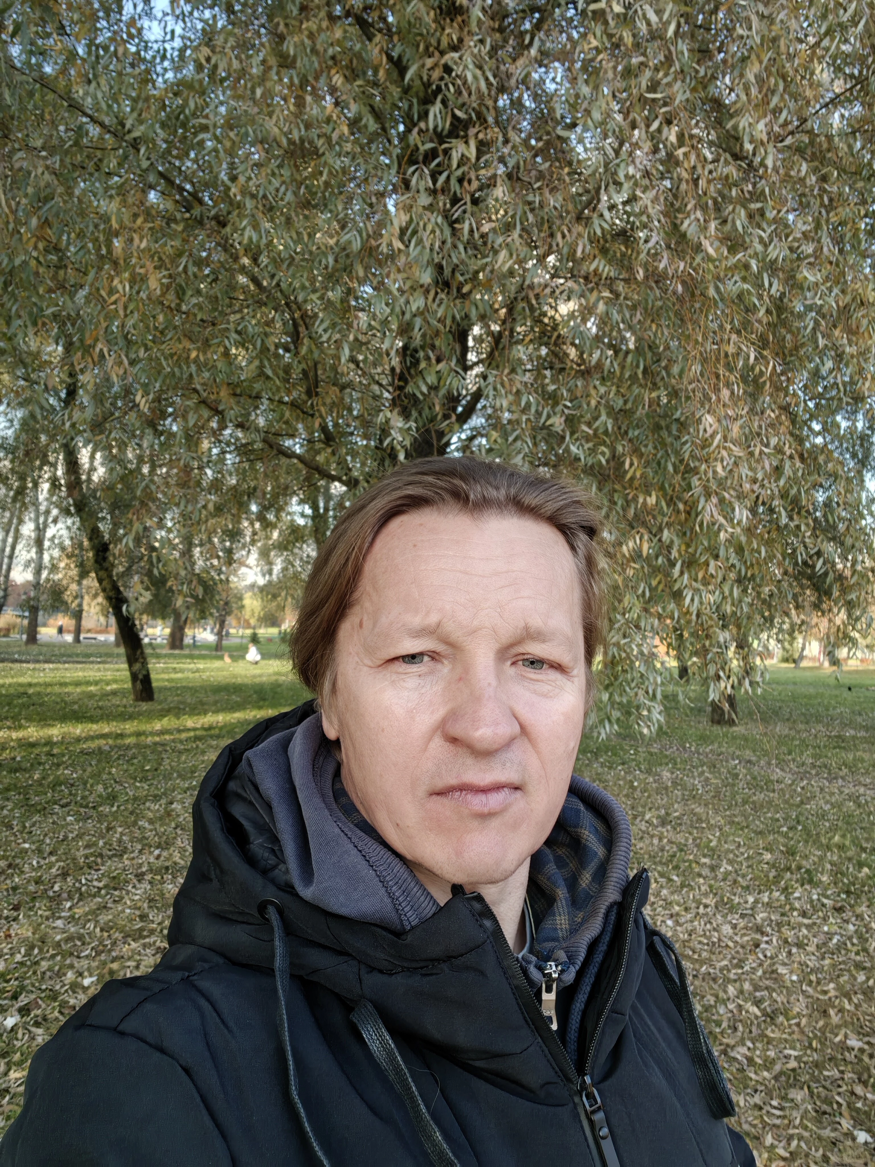 Фронтальный датчик имеет разрешение 50 Мп и светосилу f/2,4. Доступно два фокусных расстояния: с широким углом и стандартное. Картинка детализированная, четкость на хорошем уровне, цвета естественные. Фон размывается чуть менее аккуратно, чем при съемке портретов на основной датчик. Но все равно автопортреты получаются приемлемыми по качеству, а интенсивность ретуши и размытия фона тоже можно отрегулировать.